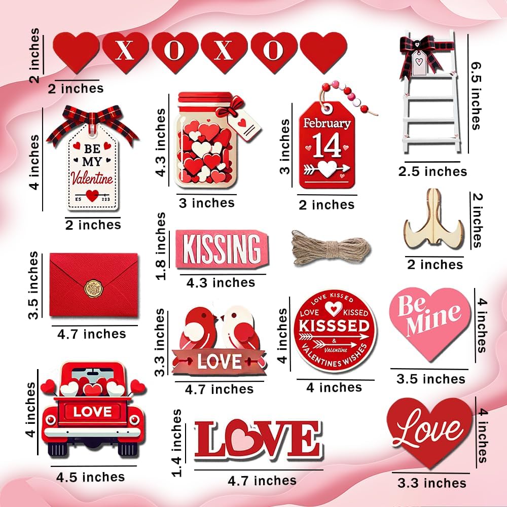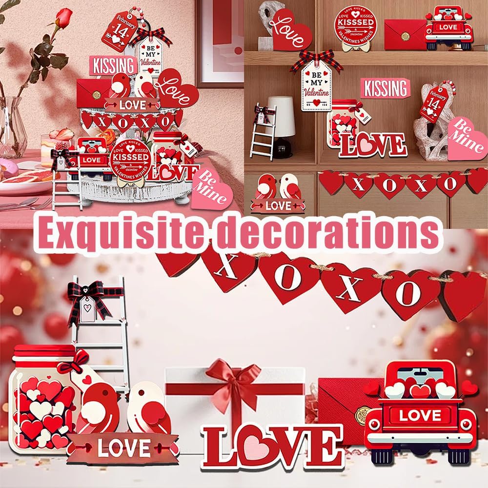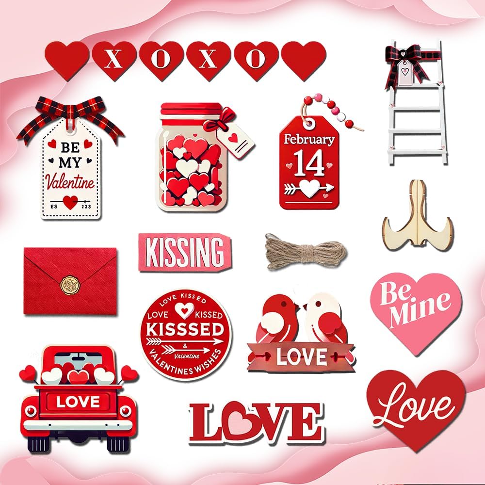 مجموعة ديكورات عيد الحب: مجموعة ديكورات صينية عيد الحب تحتوي على 21 قطعة من عناصر ديكور صينية عيد الحب، بما في ذلك طائر الحب، والظرف، وقلب الحب، وشاحنة الحب، وزجاجة التمني وعناصر عيد الحب الأخرى في مجموعة متنوعة من الأنماط، مع حبل، ودعامة و20 نقطة لاصقة سهلة التركيب، لتلبية احتياجاتك في تزيين العطلات والاستخدام اليومي.