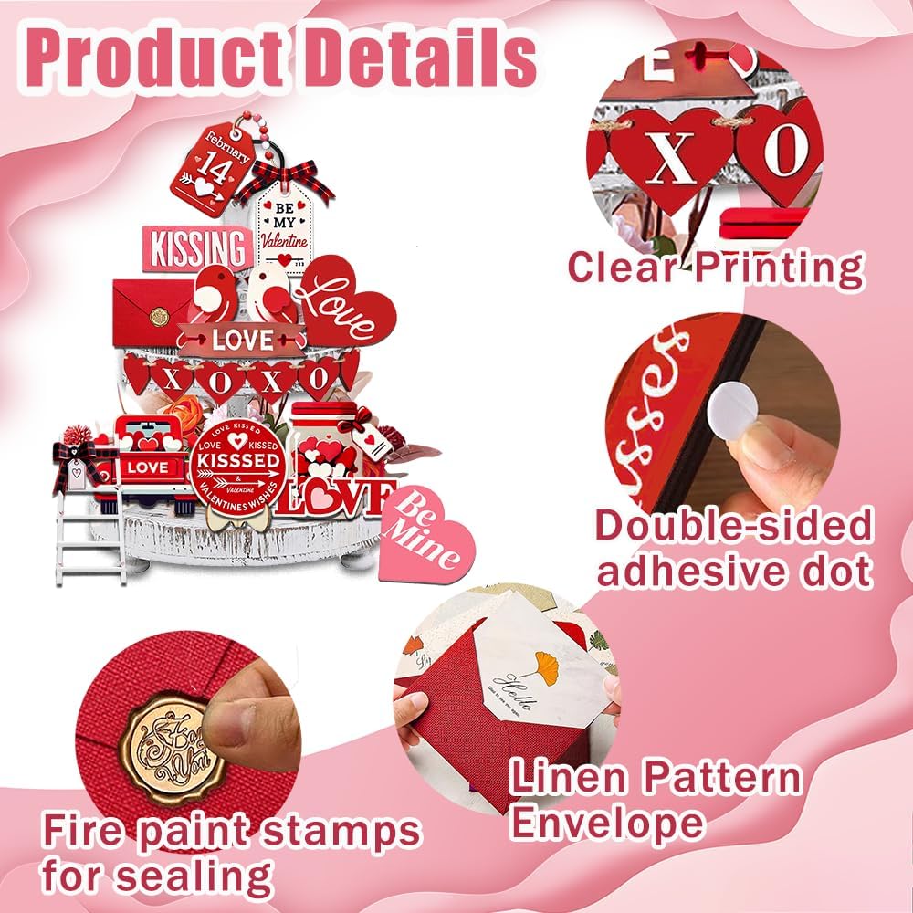 ظرف عيد الحب: بالإضافة إلى زخارف صينية الطبقات الخشبية، تتضمن مجموعة زينة صينية عيد الحب ذات الطبقات أيضًا ظرفًا صغيرًا لعيد الحب وختمًا مطليًا بالنار للختم، حتى تتمكن من التعبير عن كلماتك القلبية ومشاعر الحب القوية بحرف