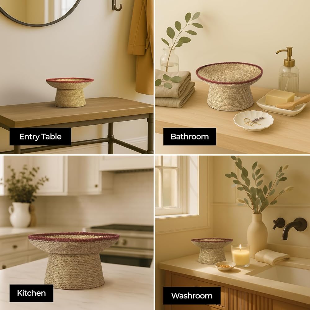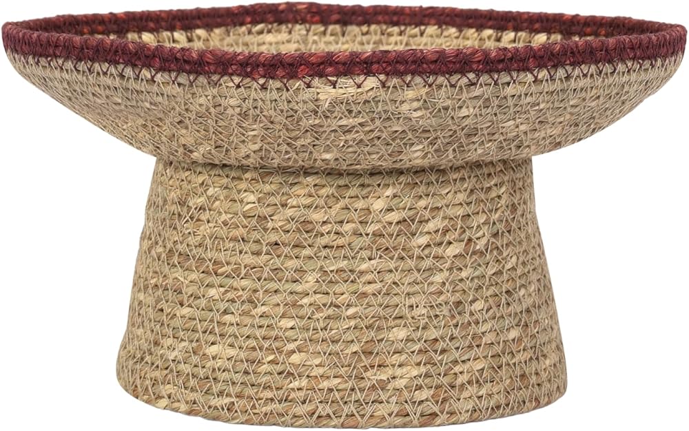 Bring an elevated layer of texture and natural beauty to your space with the Lagena round stitched pedestal bowl. Handwoven from 100% moonji grass and finished with a delicate white stitch, this 8-inch decorative bowl blends utility and artistry in one sculptural form. At 8 x 6 inches, the pedestal design gives it height and presence, making it ideal for styling on entryway tables, kitchen counters, living room shelves, or bedside tables. Use it as a key holder, fruit bowl, bathroom organizer, or simply as a decorative centerpiece that brings warmth and contrast to your space. Each bowl is handmade using traditional methods, so slight variations in size, stitching, and weave are part of its charm. The natural tones and minimalist shape complement a wide range of decor styles—from boho and cottagecore to mid-century modern and country farmhouse. More than just decor, the Lagena pedestal bowl is a tactile reminder to slow down, stay grounded, and surround yourself with thoughtful pieces that bring both style and story to your home.
