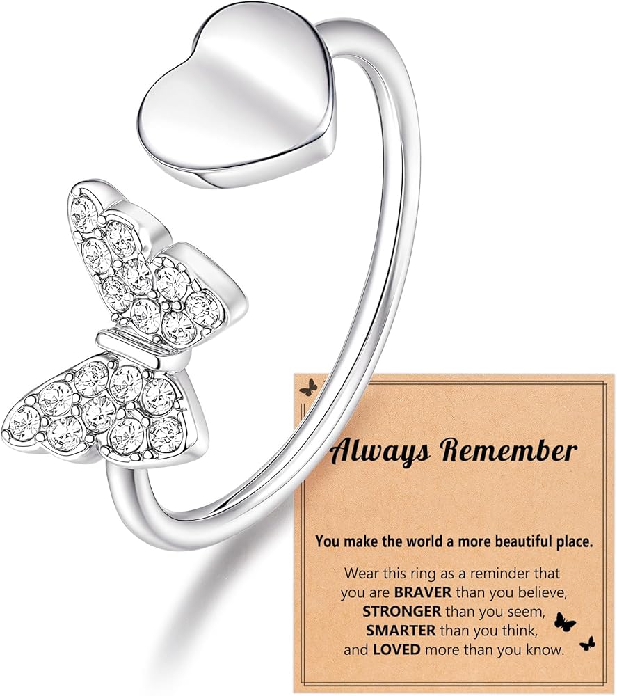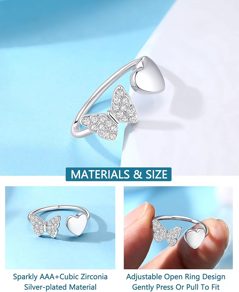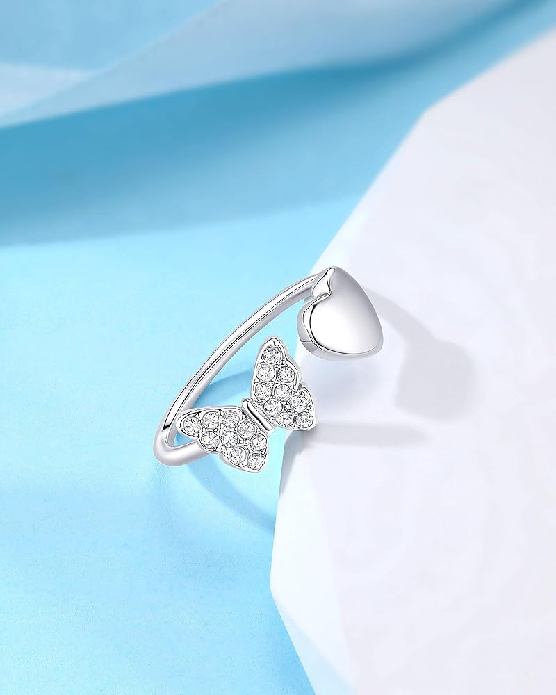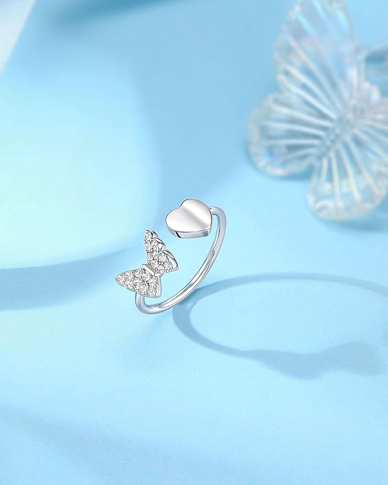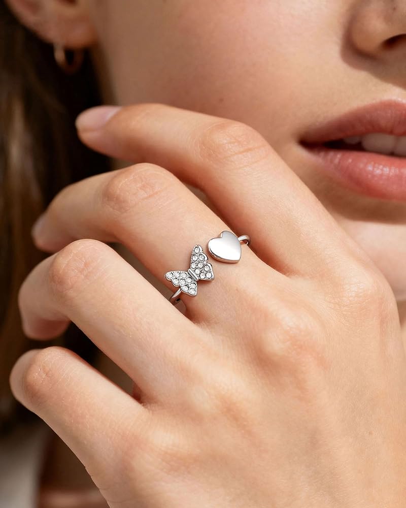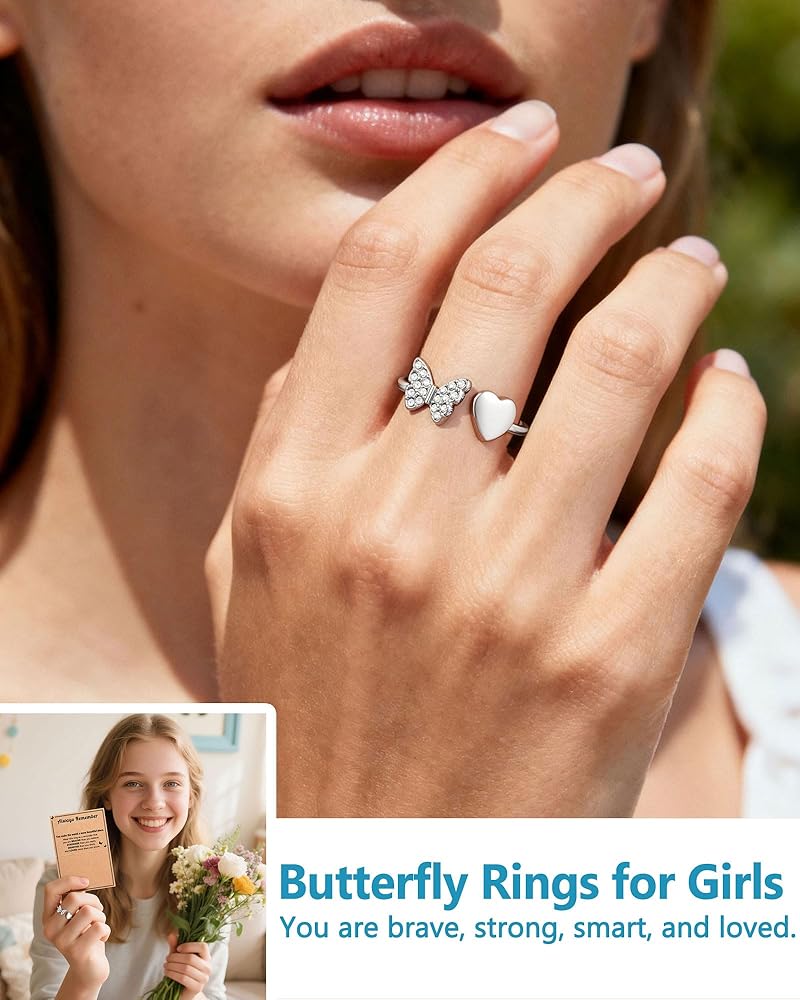 خواتم للفتيات المراهقات: يجمع هذا الخاتم بين الفراشة المتلألئة والقلب، مما يرمز إلى الحب والقوة - وهو تذكير جميل بأنها جميلة من الداخل والخارج.