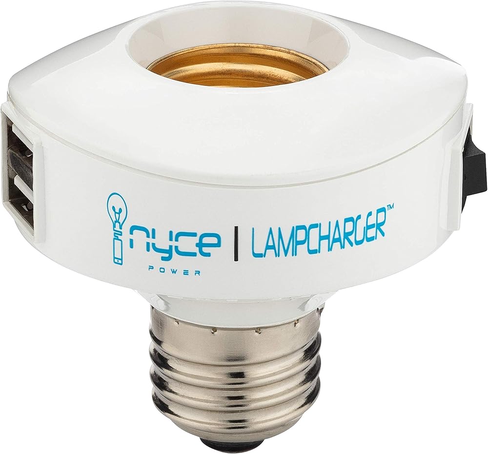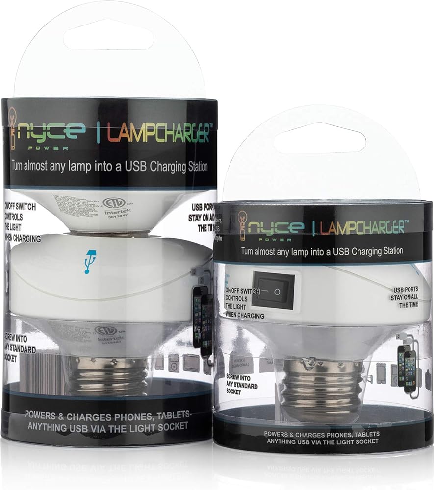 كيفية التثبيت: قم أولاً بفصل المصباح بمنفذ الحائط لضمان عدم وجود طاقة تعمل على المصباح. قم بفك المصباح الكهربائي الحالي واتركه جانباً. قم بربط Nyce Power LampCharger في مقبس المصباح حتى يتم إحكامه. قم بربط المصباح الكهربائي مرة أخرى في مقبس الإضاءة LampCharger الموجود في الجزء العلوي من المحول. تأكد من أن مفتاح الطاقة LampCharger في وضع إيقاف التشغيل. قم بتوصيل المصباح مرة أخرى بمأخذ الحائط. ستوفر منافذ USB الطاقة دون الحاجة إلى تشغيل LampCharger.