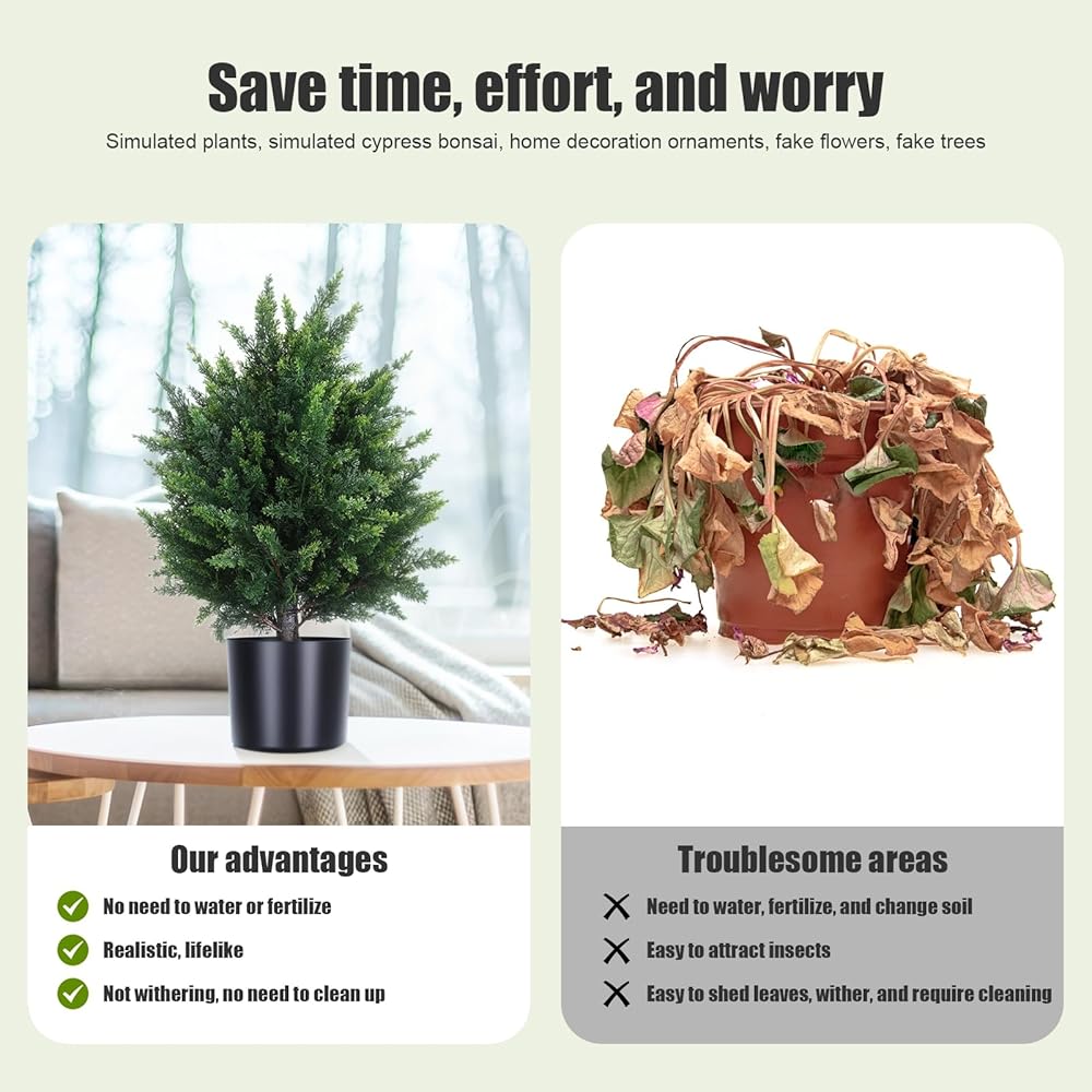 Free Maintenance: This cypress tree artificial indoor doesn't need sunlight, and fertilizing and watering it will save you from the trouble of falling leaves. Make sure artificial cypress bonsai are realistic, evergreen, and require no pruning. No need to water every day or pay special attention, just wipe it off with a damp cloth when it gets dusty. You will love how it brings life to your room without the added maintenance of a live plant.