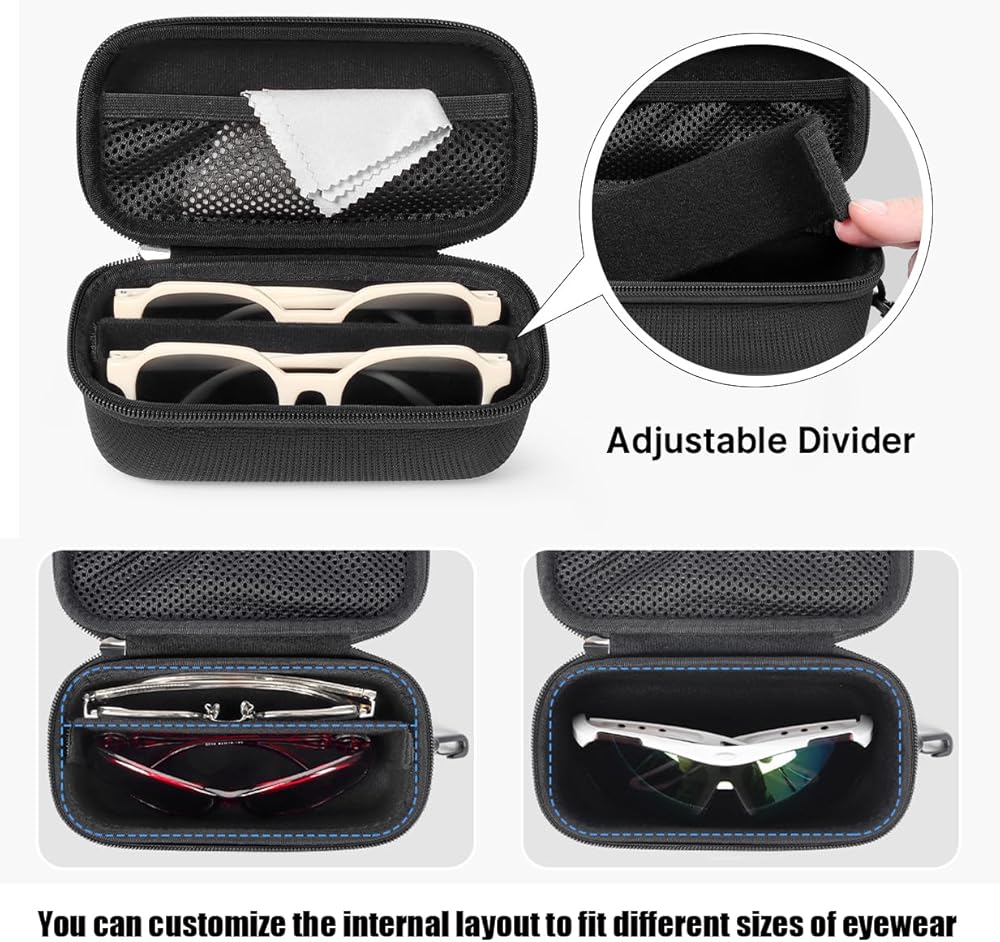 Adjustable Dual Compartments: This dual glasses case features a flexible divider that lets you customize the internal layout to fit different sizes of eyewear. Easily store your everyday glasses and sunglasses and no need to carry multiple cases anymore.