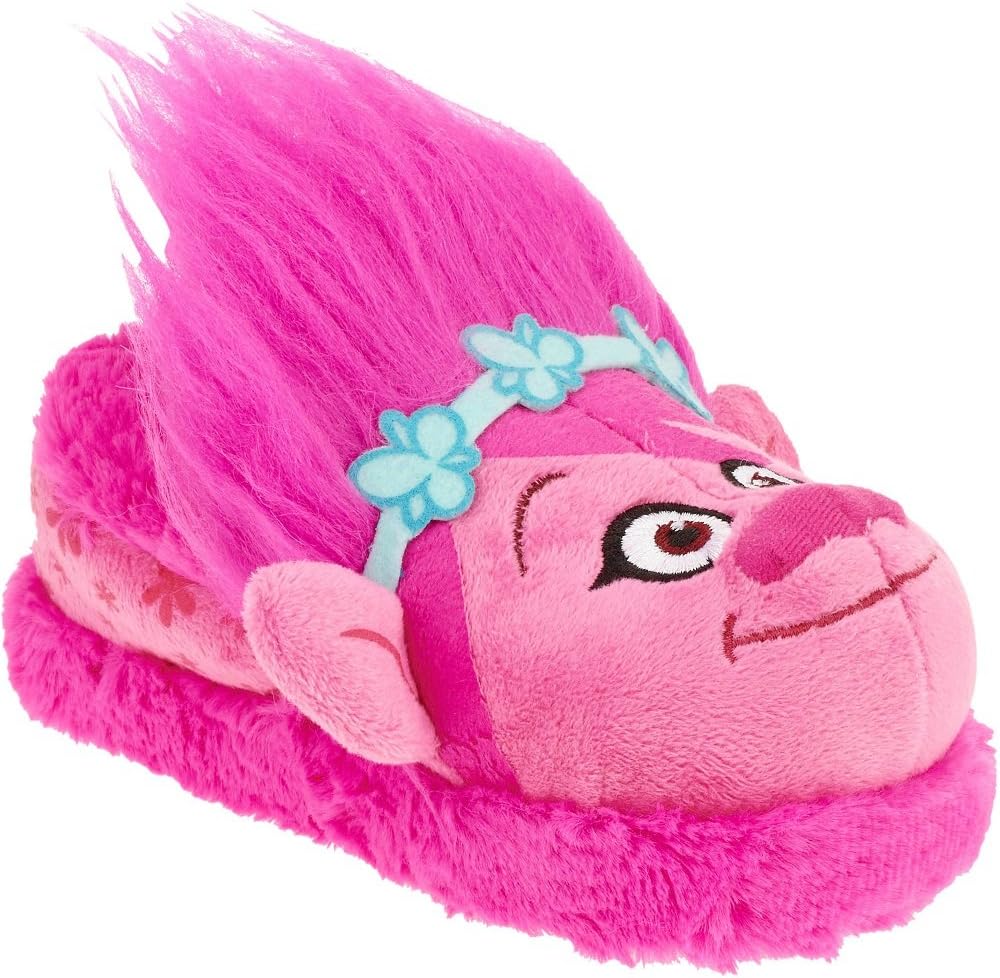 Your little one will adore the hot pink details and pillowy comfort of these toddler girls' slippers based on the Trolls, the 3D animated musical comedy film that's in turn based on the classic Troll dolls. Made of soft but durable polyester, these slippers have a super-cute fabric Troll design over the toebox with a smiling face, ears, a headband and a wild tuft of faux hair. There's a covered elastic band around the opening to ensure the slippers stay in place, while a handy set of traction bumps on the sole ensures she won't lose her footing while she's romping around on smooth surfaces. These officially licensed slippers are available in pink and are ideal for lounging.