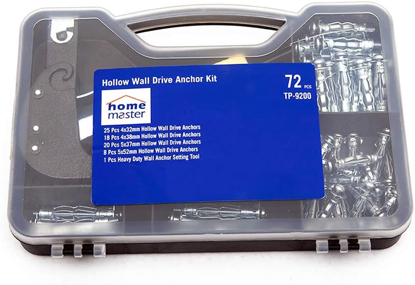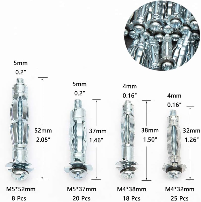 المقاسات القياسية: 4 مقاسات من نقاط التثبيت الجدارية المجوفة - بما في ذلك 4x32mm: 25قطعة، 4x38mm: 18قطعة، 5x37mm: 20 قطعة، 5x52 مم: 8 قطع. مع قطعة واحدة من أدوات الإعداد عالية التحمل في صندوق واحد. يمكنك اختيار واحد أو أكثر وفقًا لاحتياجاتك المختلفة.