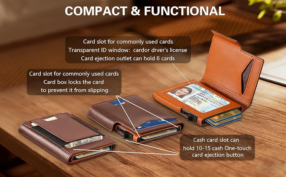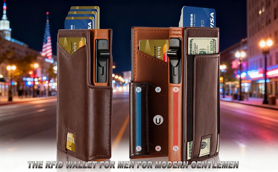 【على عكس المحافظ الجلدية التقليدية، تتميز هذه المحفظة الرجالية النحيفة بحافظة بطاقات من الألومنيوم مع آلية منبثقة. ما عليك سوى الضغط على الزر الجانبي لإخراج جميع البطاقات بطريقة متتالية لاسترجاعها بسرعة ومريحة، مما يجعلها محفظة RFID رفيعة أساسية للرجال.