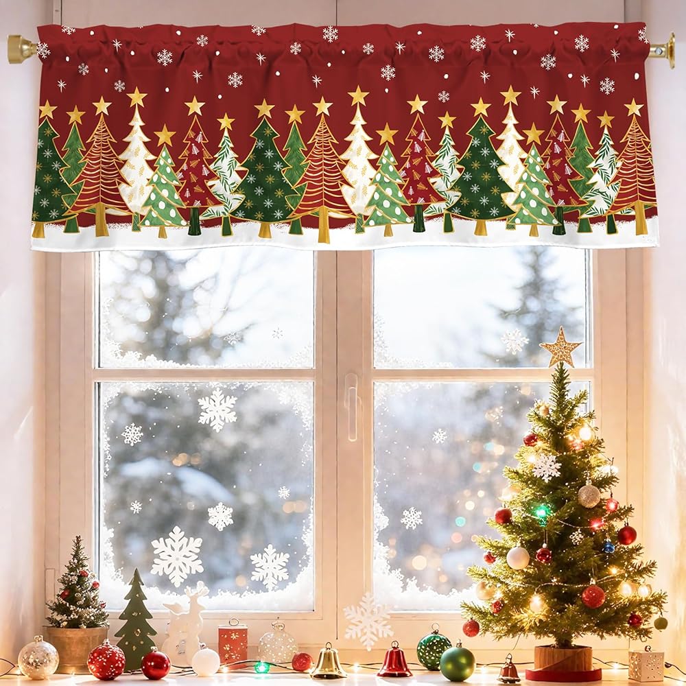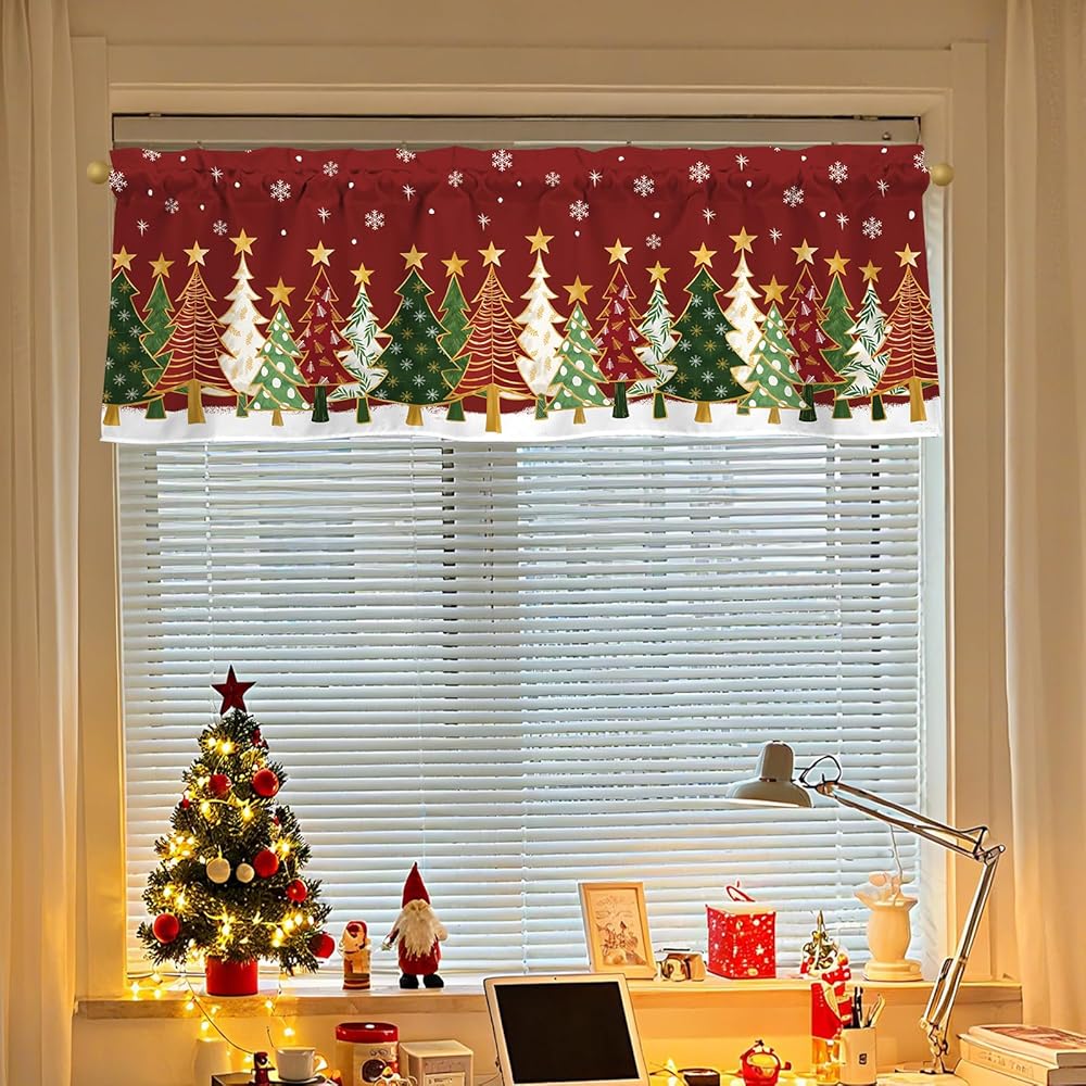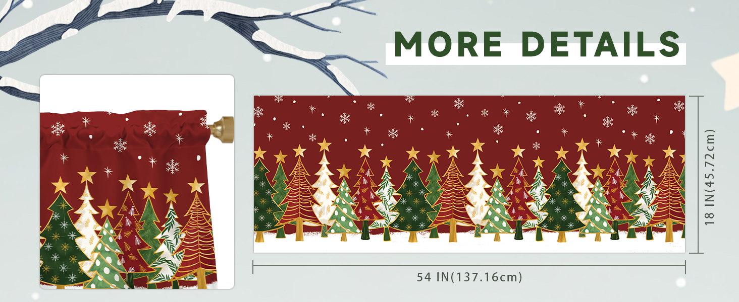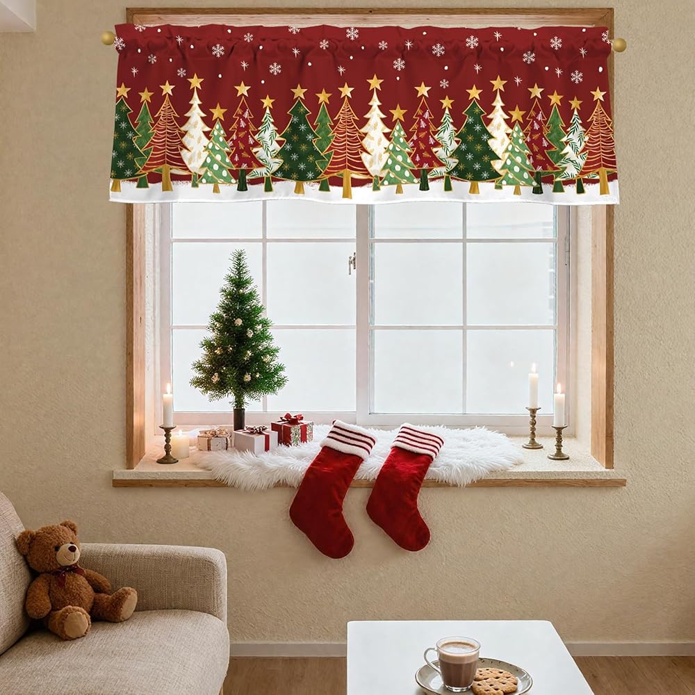 【تصميم الموضوع】تتميز الستارة القصيرة لعيد الميلاد بخلفية حمراء مع ندفات الثلج وأشجار عيد الميلاد الملونة والنجوم الذهبية، مما يخلق جوًا حيويًا واحتفاليًا لعيد الميلاد.