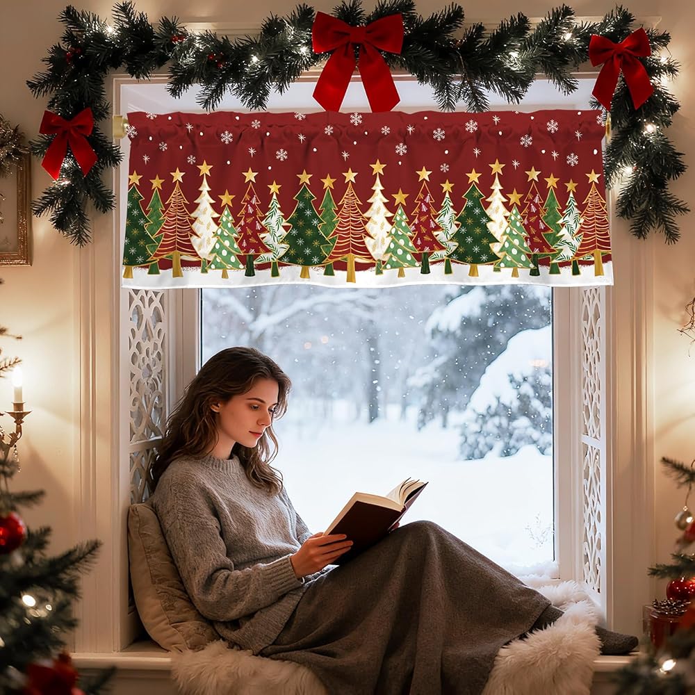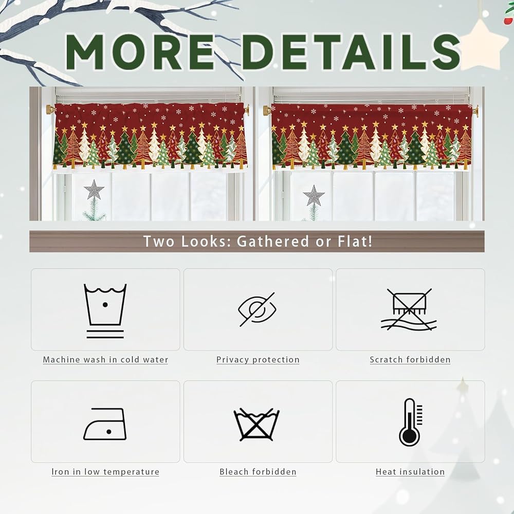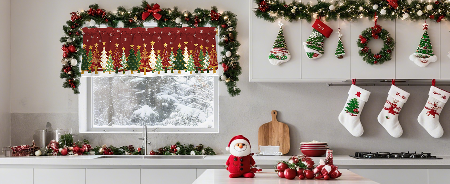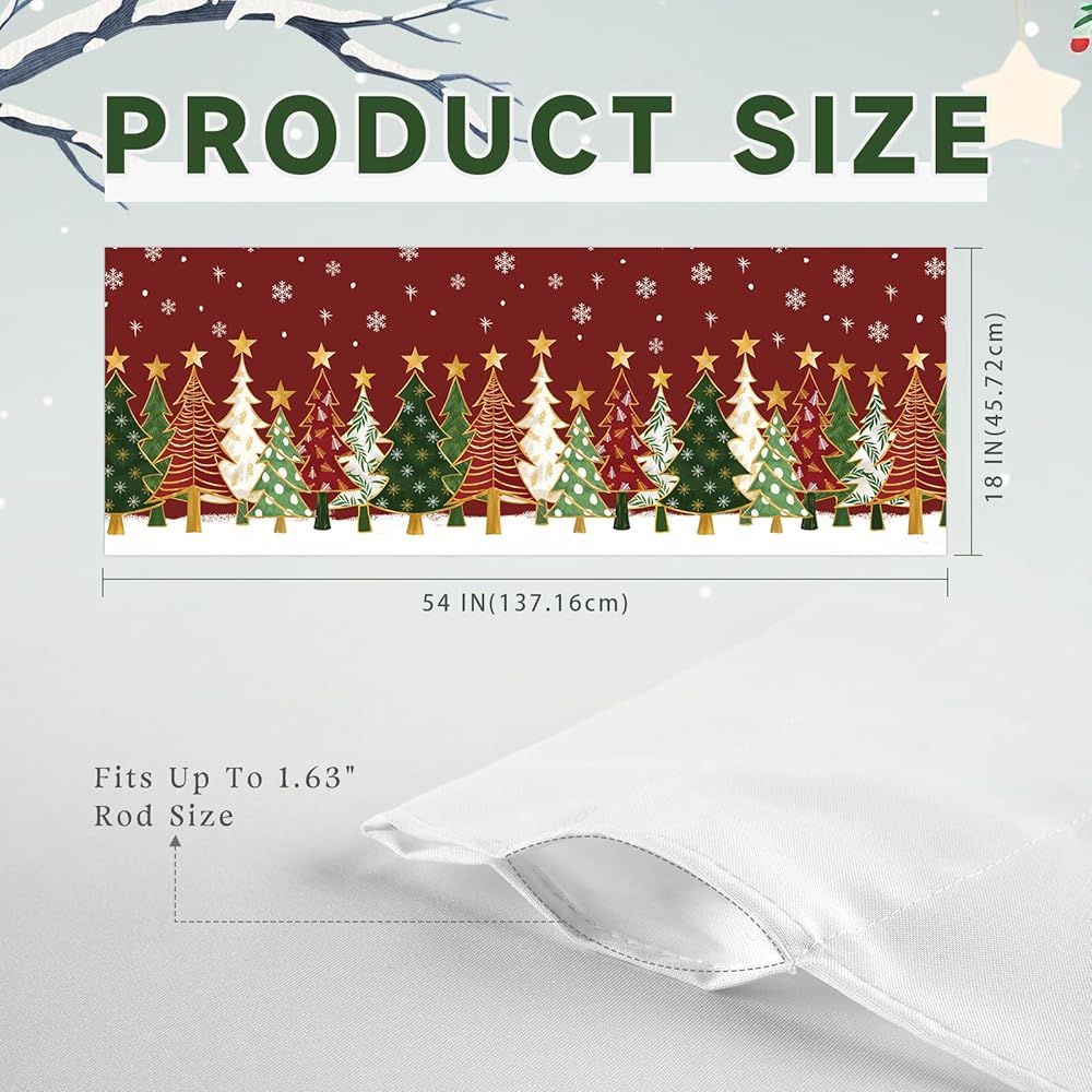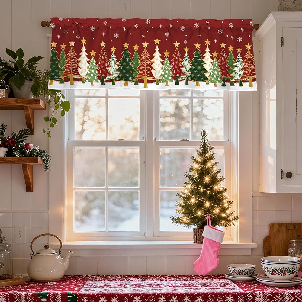 【تصميم الموضوع】تتميز الستارة القصيرة لعيد الميلاد بخلفية حمراء مع ندفات الثلج وأشجار عيد الميلاد الملونة والنجوم الذهبية، مما يخلق جوًا حيويًا واحتفاليًا لعيد الميلاد.