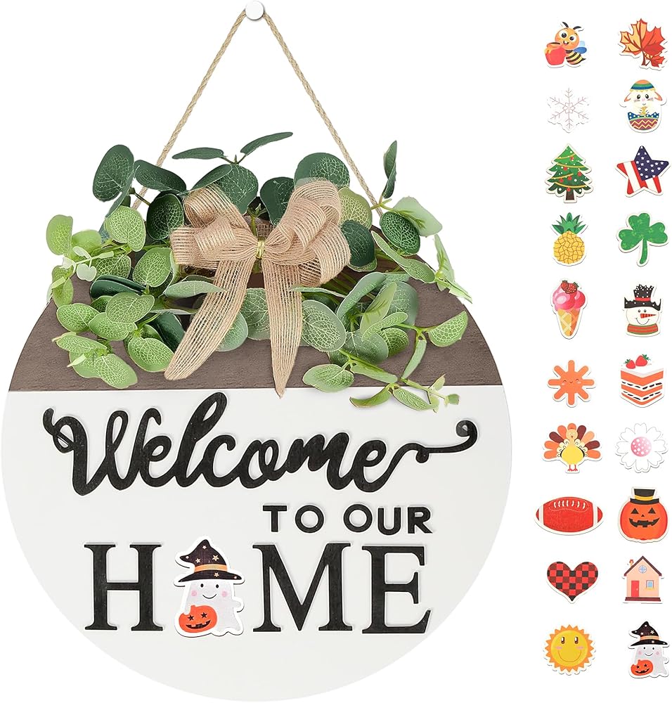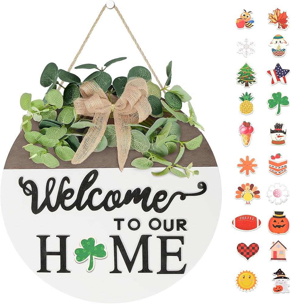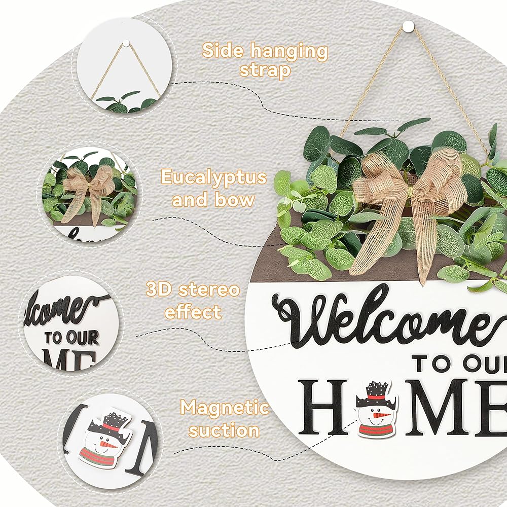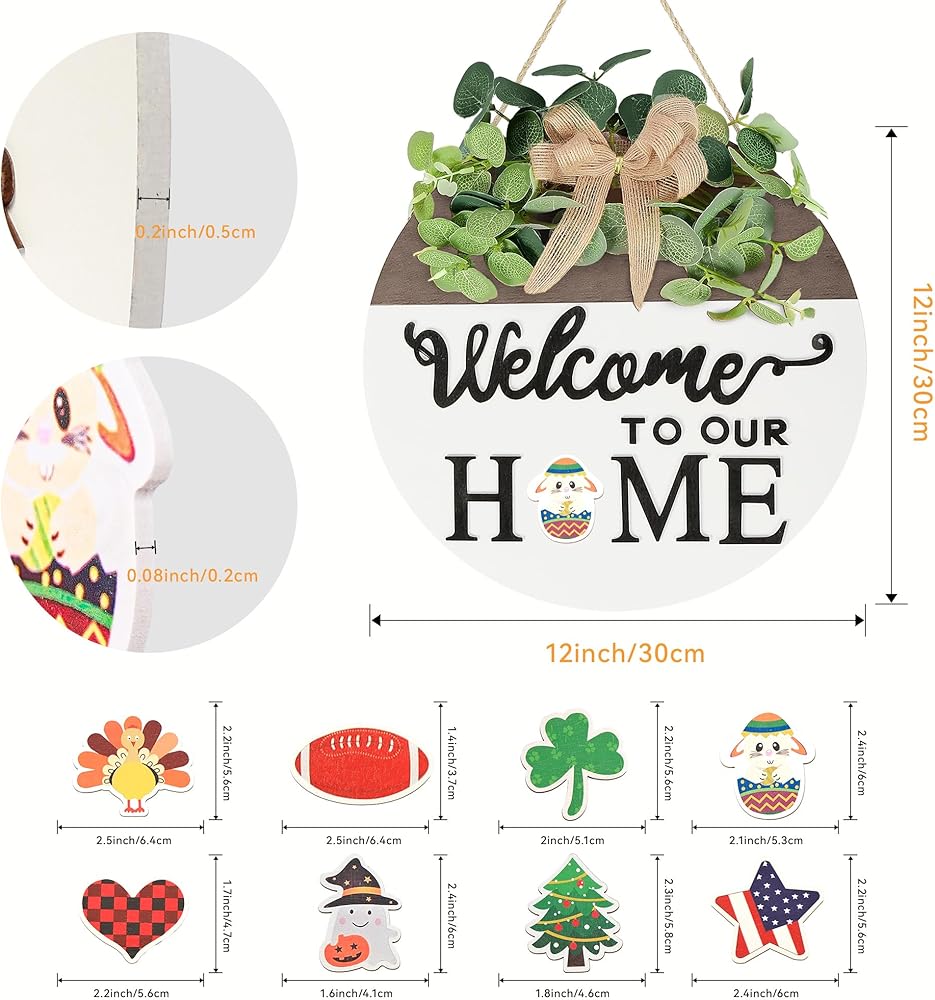 【الخامة: اللافتة الخشبية المستديرة مصنوعة من خشب عالي الجودة. الزخارف العلوية عبارة عن أوراق وأقواس من الأوكالبتوس قابلة للفصل. الملحقات الصغيرة مغناطيسية، مما يسمح باستبدالها بسهولة في أي وقت وفي أي مكان. يمكن تعديل حبل التعليق يدويًا حسب الطول المرغوب فيه ليناسب كل سيناريو بشكل مثالي ويتكيف مع المواسم المختلفة، ويجمع بين الجمال والتطبيق العملي.