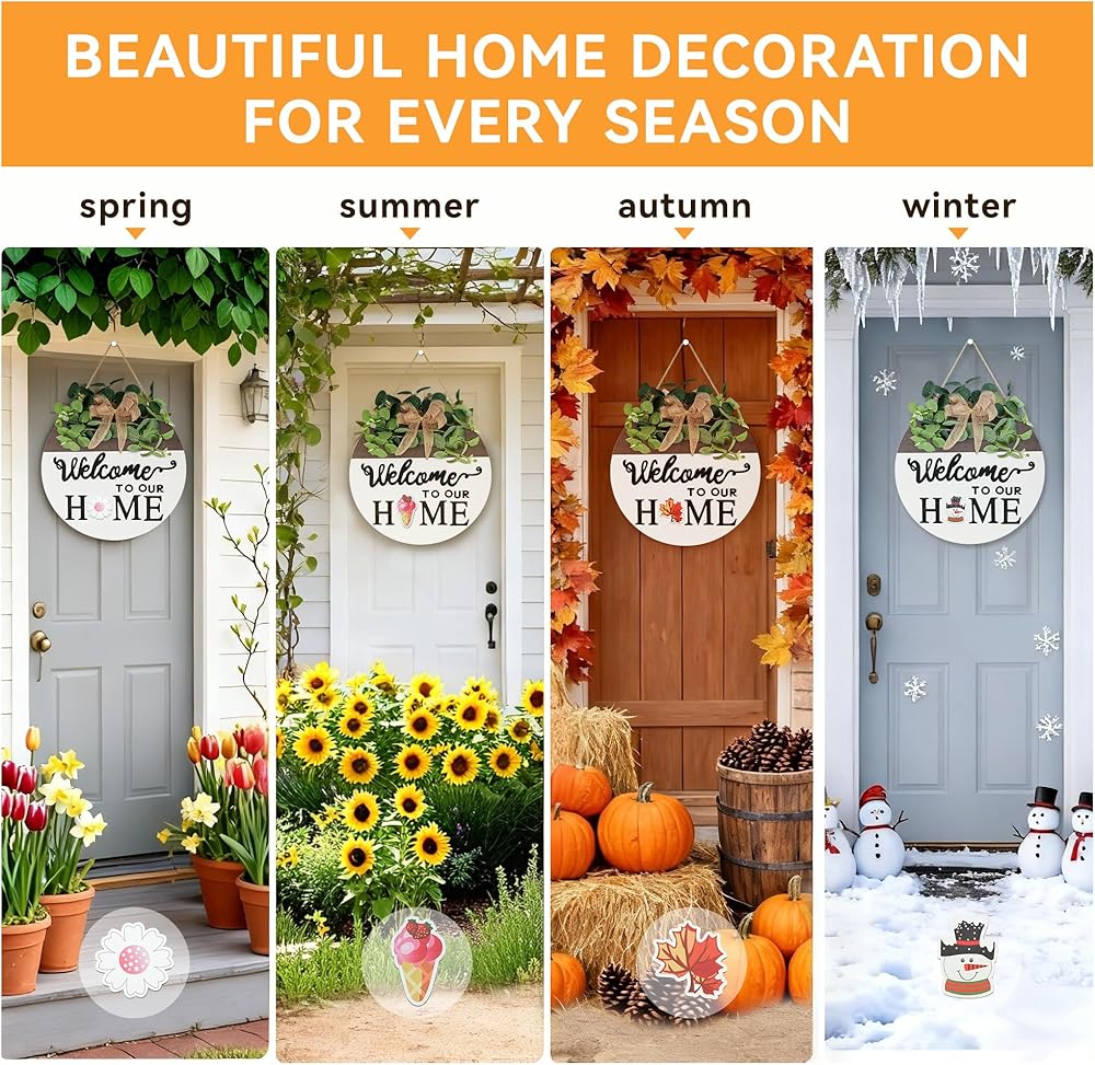 【استخدام على الوجهين】: هذا المنتج عبارة عن علامة ترحيب موسمية للباب الأمامي يمكن استخدامها على كلا الجانبين. يتميز الجانب الأمامي بلون خشبي طبيعي، بينما يتميز الجانب الخلفي بلمسة نهائية سوداء أنيقة. تأتي مع 4 أكاليل موسمية (الربيع، الصيف، الخريف، الشتاء) و16 قلادة للعطلات (الأرنب، علم النجمة المتلألئة، قلب الحب، البرسيم، الكعكة، كرة الرجبي، الأناناس، اليقطين، الشمس، عباد الشمس، شجرة الكريسماس، النحلة، الزهرة، الديك الرومي، المنزل، الشبح). يمكنك بسهولة تحديث ديكور الباب الأمامي الخاص بك عن طريق استبدال الألواح الخشبية الموسمية الصغيرة أو الزهور العلوية أو قلب اللافتة لاستخدام الجانب الآخر.
