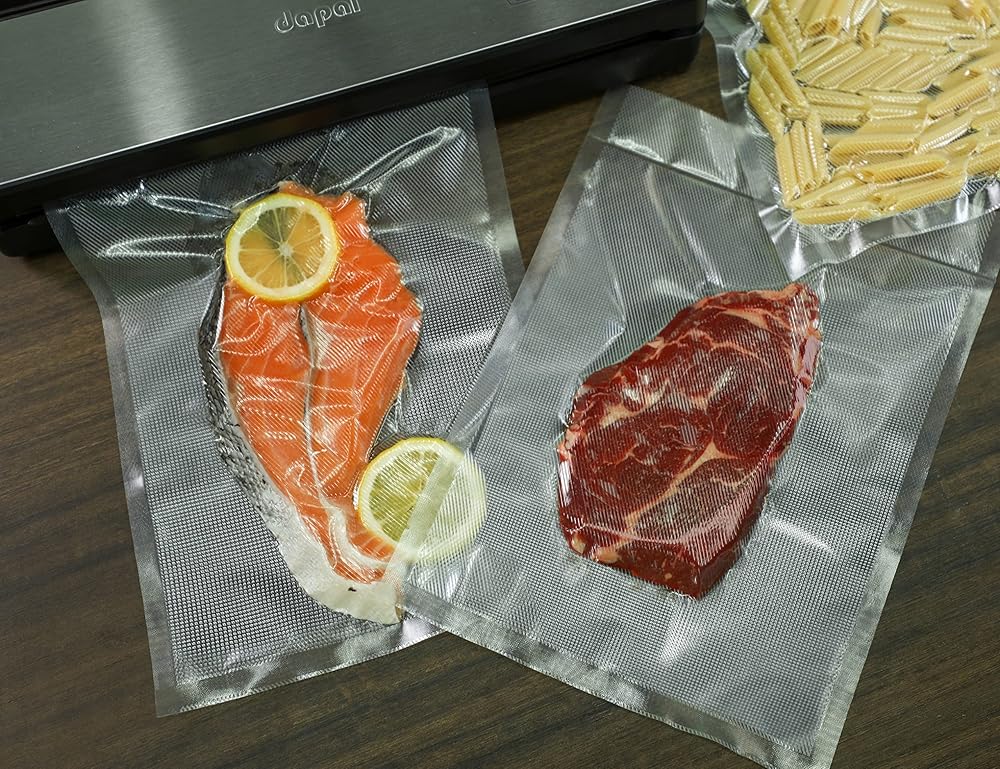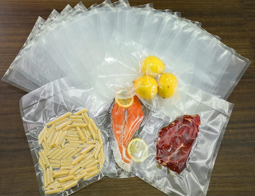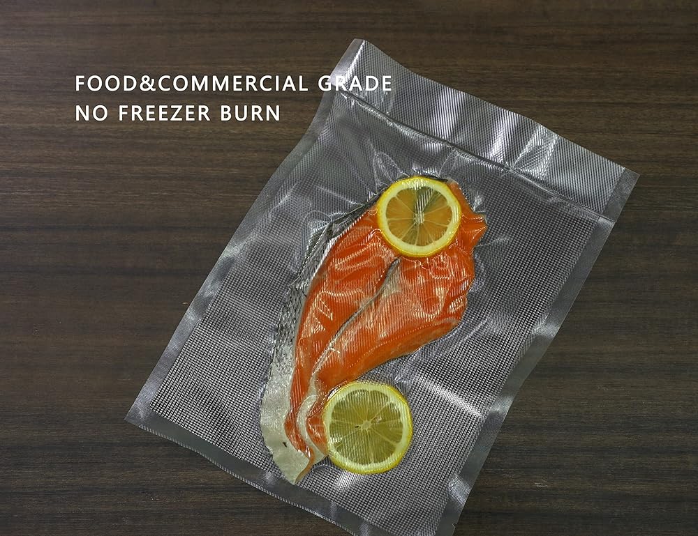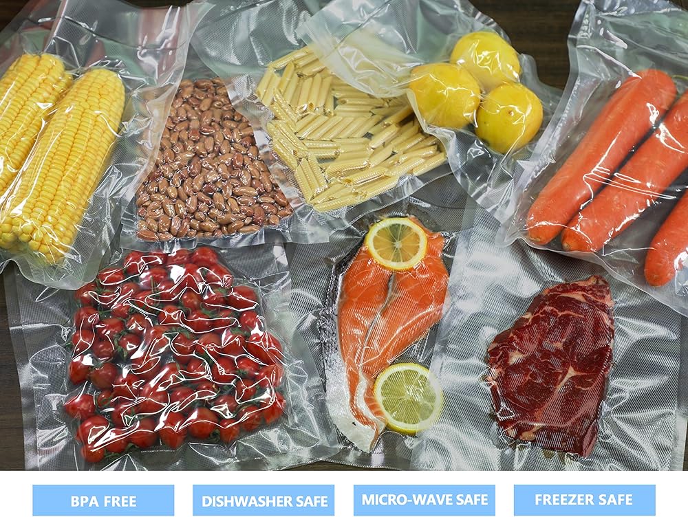 • FOOD GRADE MATERIAL AND BPA FREE : Bags are great for storing raw and cooked foods.It's also for cook,freezable,dishwasher,microwave,and boilable safe.Our vacuum sealer bags are with embossed channels to increase suction to vacuum sealer .Easier to be sealed.< br >