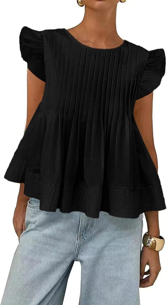 Csvinkiko Women's Summer Blouses Pleated Peplum Ruffle Sleeve Blouse Round Neck A Line Babydoll Shirts Tops