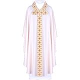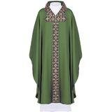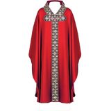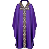 The flowing robe features a stunning decorative cross pattern adorned with intricate medieval-inspired embroidery along the collar and center panel. Available in traditional liturgical colors including red, green, purple, and white, this vestment is crafted to drape elegantly during religious ceremonies. The unisex design ensures a proper fit for all clergy members, while the generous cut allows freedom of movement during Mass celebrations. The ornate brocade trim showcases detailed geometric patterns that reflect centuries of ecclesiastical artistry. Perfect for daily Mass, special celebrations, and other church ceremonies, this chasuble combines dignified aesthetics with practical functionality. The mid-length cut and loose-fitting style maintain traditional proportions while offering comfort during extended wear. Each color option features matching decorative bands that create a cohesive, reverent appearance suitable for Catholic church services.