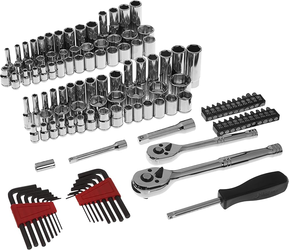 - مجموعة أدوات ومقابس ميكانيكية مكونة من 145 قطعة للتعامل مع أحجام وأنواع متعددة من أدوات التثبيت، وخاصة الصواميل والمسامير