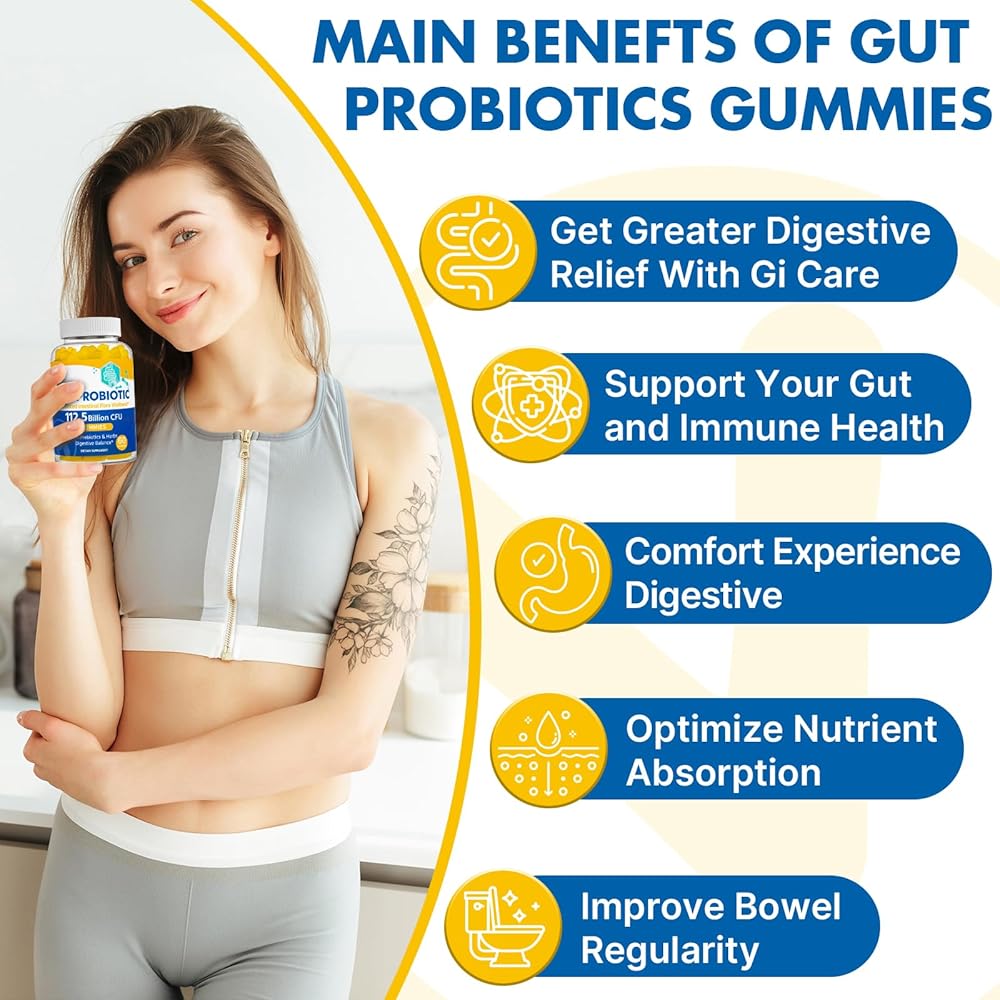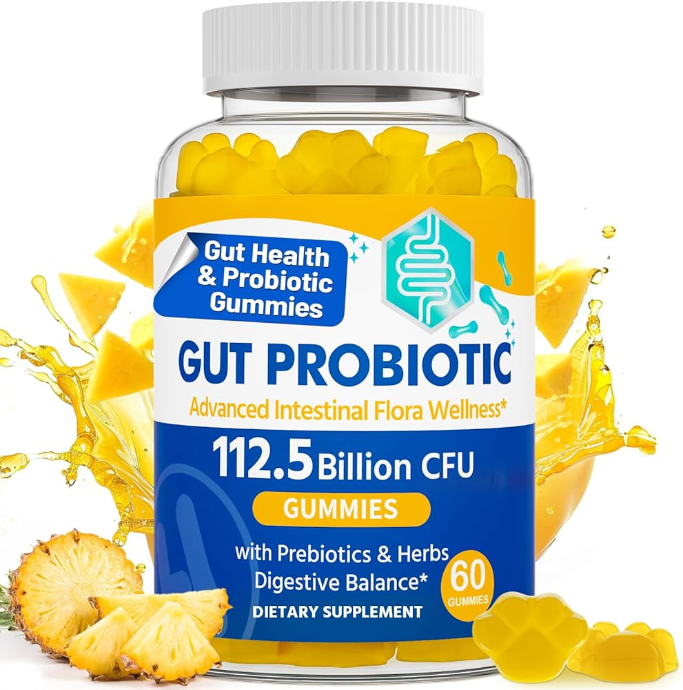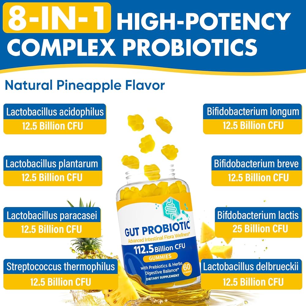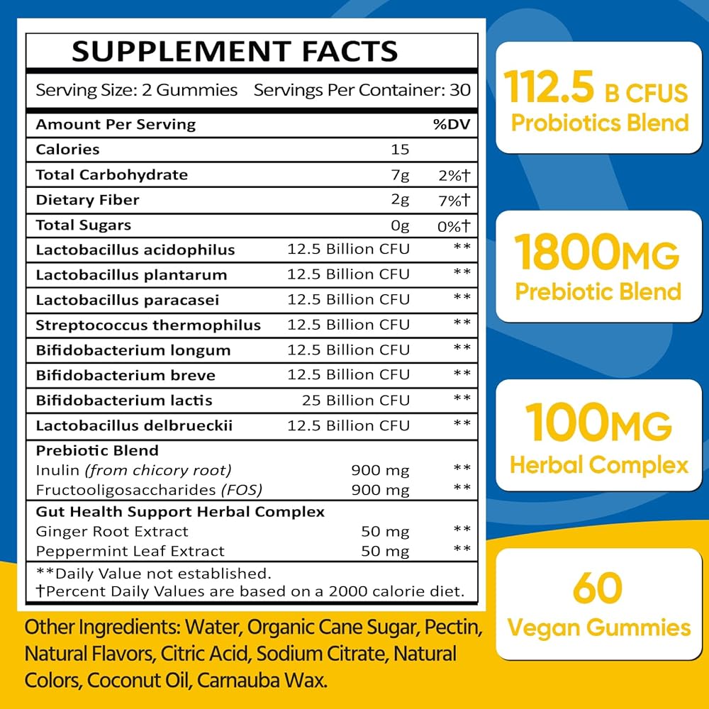 علكة صحة الأمعاء والبروبيوتيك، 112.5 مليار وحدة تشكيل مستعمرة، خالية من السكر - 8 سلالات + البريبايوتكس + أعشاب - للجهاز الهضمي والمناعة والإسهال والانتفاخ - صحة الأمعاء للنساء والرجال، 60 قطعة علكات بروبيوتيك