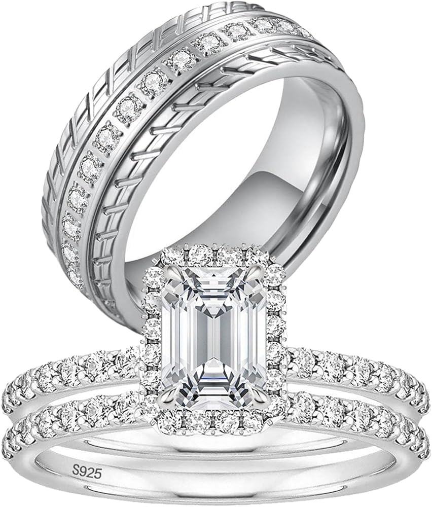 • Luxury S925 Sterling Silver Couple Rings Designed for couples and lovers, this bridal ring set features a rectangle stone centerpiece, mimicking high-end diamond rings. The hypoallergenic metal ensures comfort, perfect for daily wear or special occasions.
