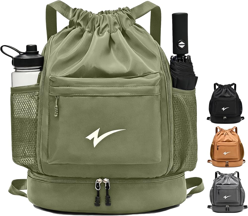 SMART ORGANIZATION: Features 5 compartments including main drawstring section, front zipper pocket for valuables, mesh side pockets, and dedicated shoe storage