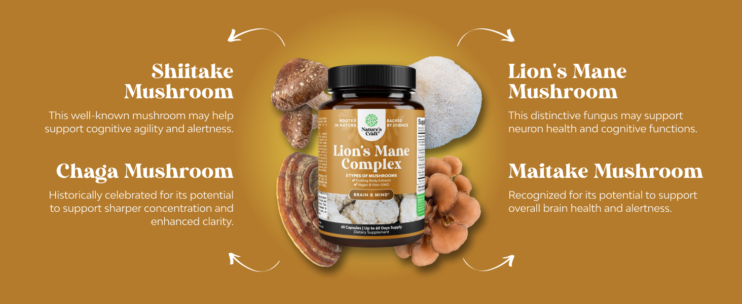 مكمل دعم الدماغ نوتروبيكس - تُستخدم كبسولات عرف الأسد بشكل شائع للمساعدة في تعزيز الأداء الإدراكي ولكن كبسولات الفطر المعقدة لدينا تحتوي أيضًا على تشاجا وريشي للحصول على فوائد تآزرية.