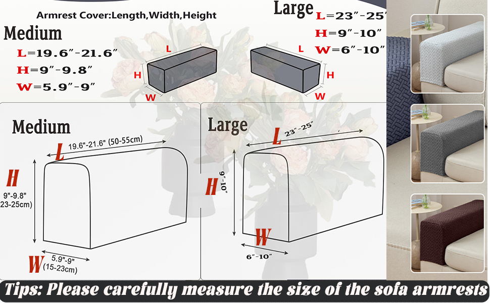 العبوة والحجم------ تحتوي العبوة على 2 غطاء لذراع الأريكة و10 مسامير ملتوية. الحجم المتوسط مناسب لمساند الذراعين بطول 19.6 بوصة، وعرض 5.9 بوصة، وارتفاع 9 بوصة؛ الحجم الكبير مناسب لطول 23 بوصة، وعرض 6 بوصة، وارتفاع 9 بوصة. قبل الشراء، يرجى قياس حجم مسند ذراع الأريكة واختيار المقاس المناسب