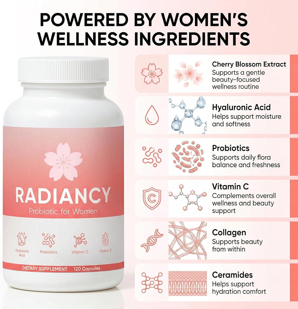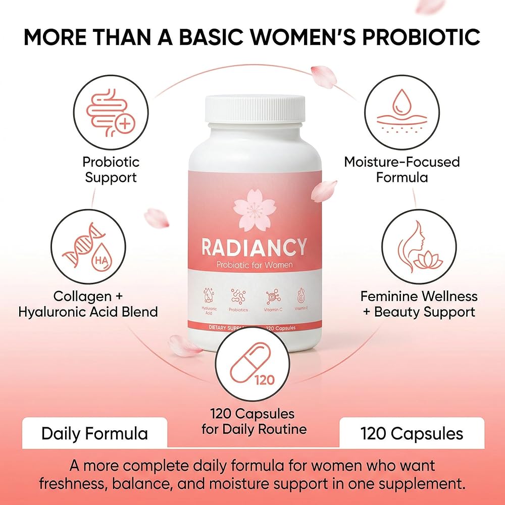 بروبيوتيك راديانسي للنساء، بروبيوتيك مهبلي للجفاف وتوازن درجة الحموضة، مستخلص زهر الكرز، حمض الهيالورونيك، البروبيوتيك، فيتامين ج، 120 قيراط
