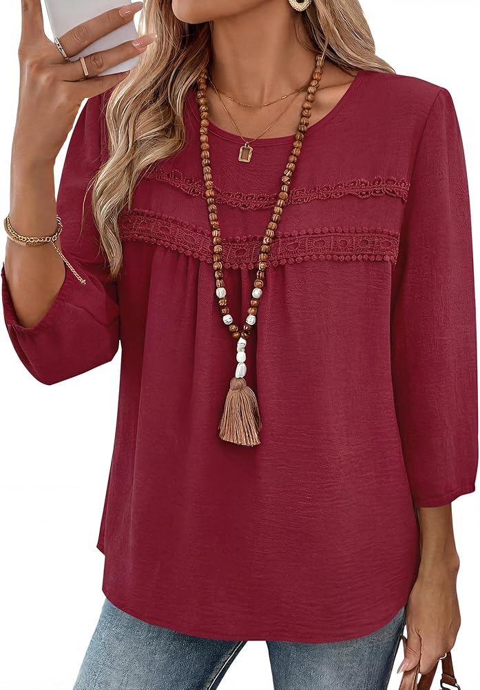 Stay effortlessly chic with the Ivicoer Women's Crew Neck Crochet Lace Boho 3/4 Sleeve Shirt, crafted from soft, lightweight, and breathable fabric that keeps you comfortable all day long—whether you're at work, on vacation, or enjoying music festivals.Designed with a classic crewneck, solid color, and delicate floral print, this elegant blouse features beautiful crochet lace edges and charming pearl buttons on the back, adding a graceful touch that radiates confidence and femininity.This chic top offers endless styling possibilities—pair it with jeans for a relaxed weekend look, trousers for a polished office outfit, or a skirt for date nights and special occasions. No matter the season or setting, its timeless design complements your unique sense of style.The elegant 3/4 sleeve design offers just the right coverage for all seasons, making it perfect for layering or wearing on its own. Delicate crochet lace details add a feminine, boho-inspired charm that elevates any outfit. With its relaxed fit and flowy silhouette, this blouse drapes beautifully on all body types—offering both comfort and confidence. Effortlessly versatile, it pairs seamlessly with jeans, skirts, or trousers, making it a timeless wardrobe staple you'll reach for again and again.Please refer to our size chart before ordering. Hand or machine wash recommended; hang dry; do not bleach.