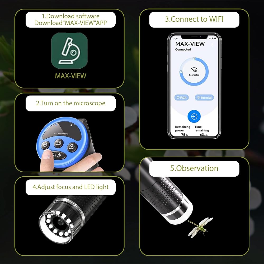 🔬🍃【مجهر بلوتوث وتطبيق مجاني】يمكنك تنزيل وتثبيت التطبيق المجاني (MAX-VIEW) على جهازك المحمول (Android أو iPhone) لتلقي صور المجهر، وهو سهل الاستخدام للغاية. تحتاج إلى ضبط واي فاي للاتصال بالمجهر، وبمجرد الاتصال يمكنك مراقبة الأشياء والتقاط الصور وحتى تسجيل مقاطع الفيديو من خلالها. يمكنك أيضًا التحقق من حالة الطاقة في الوقت الفعلي، وهو أمر مريح للحمل.