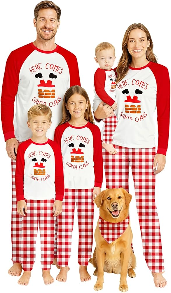 Matching family Christmas pajamas with playful graphic and pants