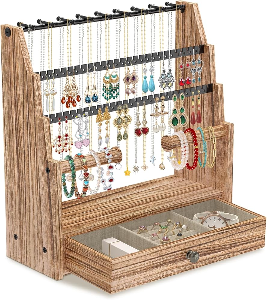 EsLuker.ly حامل القرط المنظم شجرة عرض القلادة، رف تخزين المجوهرات ذو سعة كبيرة للنساء، حامل برج حلق من الخشب الريفي 5 طبقات مع 260 فتحة و20 خطافًا لبيع البائعين in Kuwait