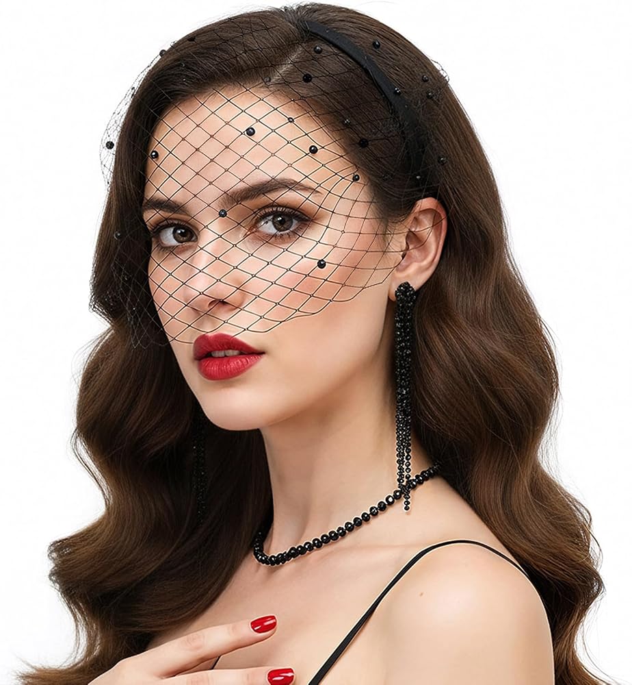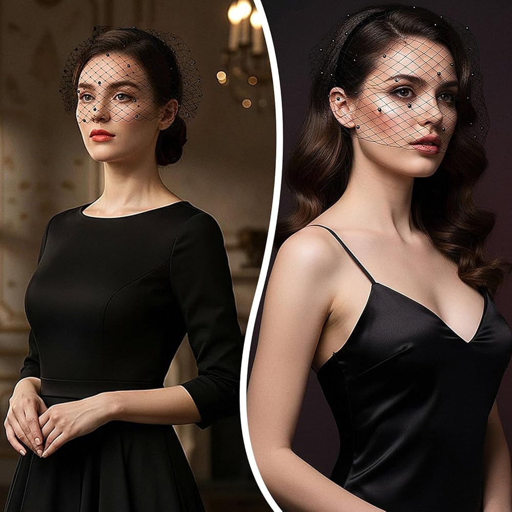 Elegant Black Veil: Crafted from lightweight mesh, shimmering crystal rhinestones, and a flexible plastic headband, this vintage birdcage veil combines comfort with dramatic flair. The retro-inspired design features a delicate black mesh adorned with stunning rhinestones, adding an air of mystery and sophistication. One size fits all women and teens, making it a versatile accessory for any ensemble.
