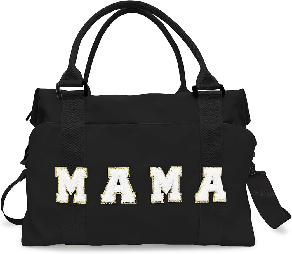 حقيبة دفل بحروف شانيل، حقيبة ماما مع رقع، حقيبة سفر مطرزة بحروف شانيل من النايلون، حقيبة مستشفى خفيفة الوزن قابلة للتعديل مع سحاب لهدايا عيد الأم (أسود)