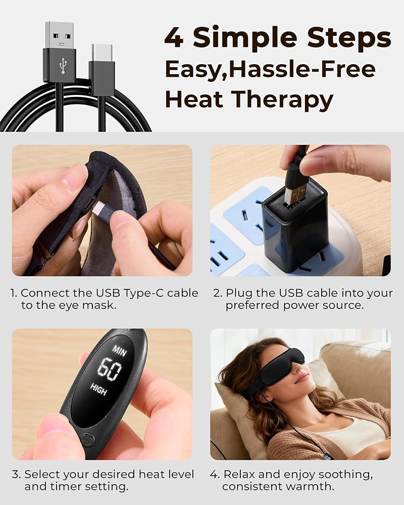USB Powered & Wide Compatibility: Equipped with a 64-inch USB cable and Type-C connector, this electric heated eye mask can be powered by computers, power banks, car chargers, or USB adapters (adapter not included). Its portable and travel-friendly design makes it easy to enjoy soothing warmth anytime, anywhere.