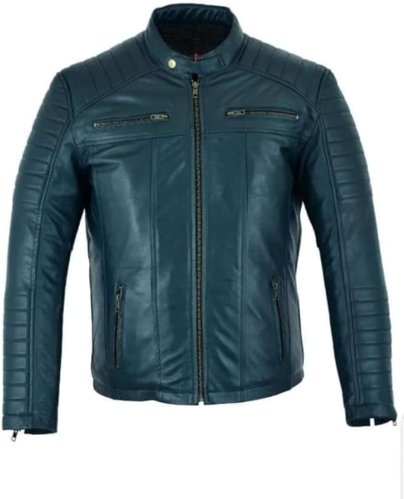 Clinch the rugged style of a genuine leather biker jacket that exudes confidence and attitude. Crafted from premium shepskin leather, this moto-inspired jacket boasts a sleek design with quilted shoulder detailing for a touch of edginess. The deep teal hue adds a rich, sophisticated touch, while zippered pockets provide convenient storage. Whether cruising on your motorcycle or making a statement in the city, this jacket offers uncompromising quality and timeless appeal. With its durable construction and tailored fit, it's a versatile piece that effortlessly elevates any casual or dressy ensemble.