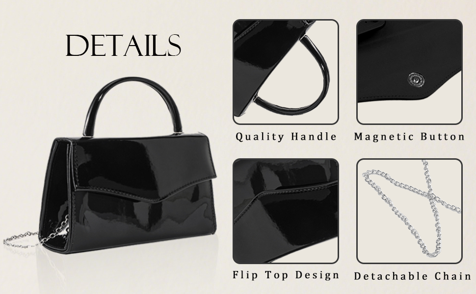 خامة ممتازة: محفظتنا الجلدية السوداء الحاصلة على براءة اختراع مصنوعة من جلد لامع عالي اللمعان مع بطانة ناعمة ومتينة. تجمع حقيبة السهرة بين المتانة والتصميم العصري، مما يجعلها إكسسوارًا مثاليًا لأي مناسبة رسمية
