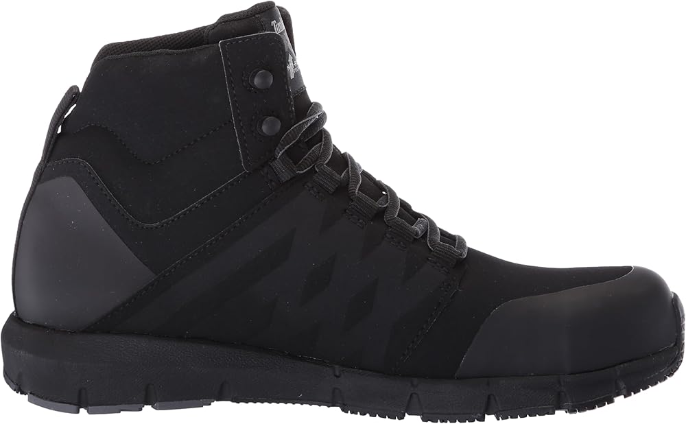 They may resemble your favorite athletic shoes, but our men's Radius work boots in a mid-height style for greater ankle protection, are built to take on the toughest job sites and help keep your feet comfortable. Utilizing Timberland PRO FLEX technology, durable stretch fabrics are incorporated with rubber outsoles that have anatomically positioned flex grooves so you get full range of motion without resistance. Their metal- and mutilation-free uppers consist of our premium Raptek microfiber that has a superior feel and less cracking than natural leather, plus breathable, durable mesh with abrasion-resistant reinforcements. We added composite safety toes, electrical hazard protection, our Anti-Fatigue Technology footbed for shock absorption and energy return, a lightweight HoverSpring foam midsole for industry-leading comfort, durability, and flexibility, a breathable and moisture-wicking lining made of ReBOTL material containing at least 50% recycled plastic.