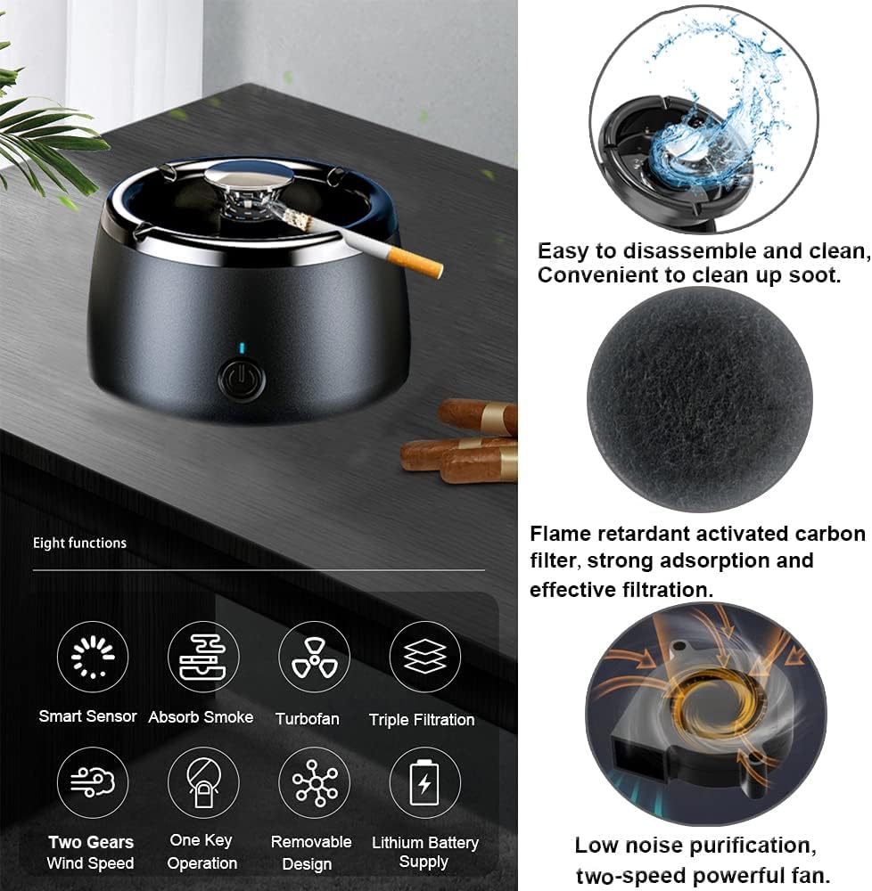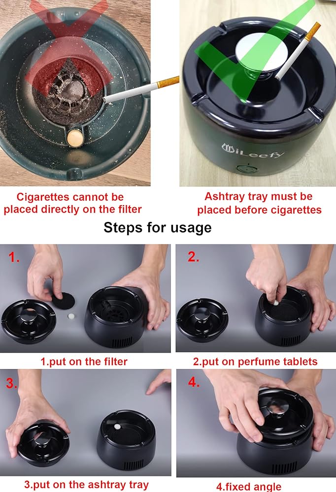 منفضة سجائر بدون دخان: تحتوي منفضة سجائر بدون دخان على فلتر ومروحة رياح عالية، والتي تزيل معظم الدخان، ويتم ترشيحها بواسطة فلتر أثناء تنفس الهواء النقي من الخلف لحماية صحة الأسرة. يوصى باستبدال الفلتر لمدة نصف شهر. يتوفر الفلتر في متجر اي ليفي ، ASIN# B09TS8JTBM.