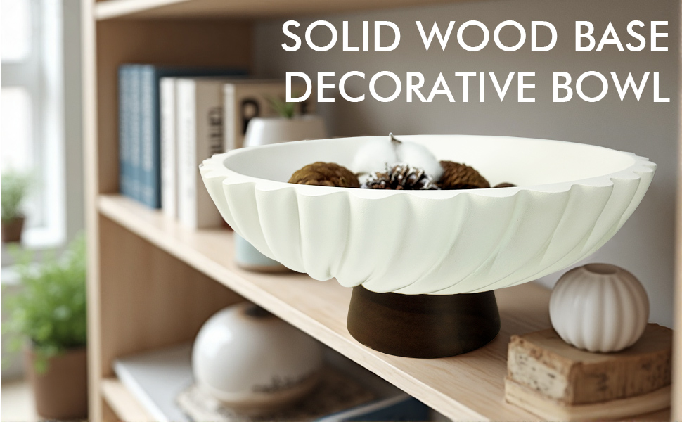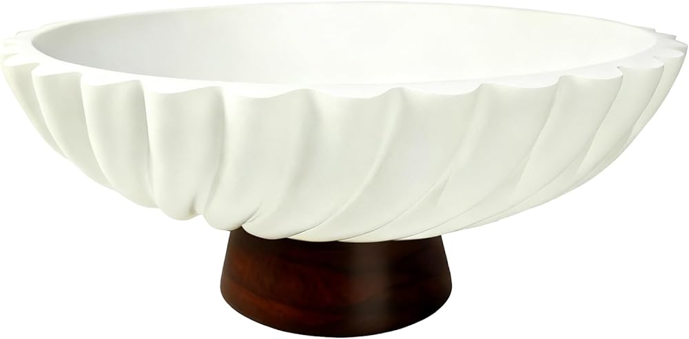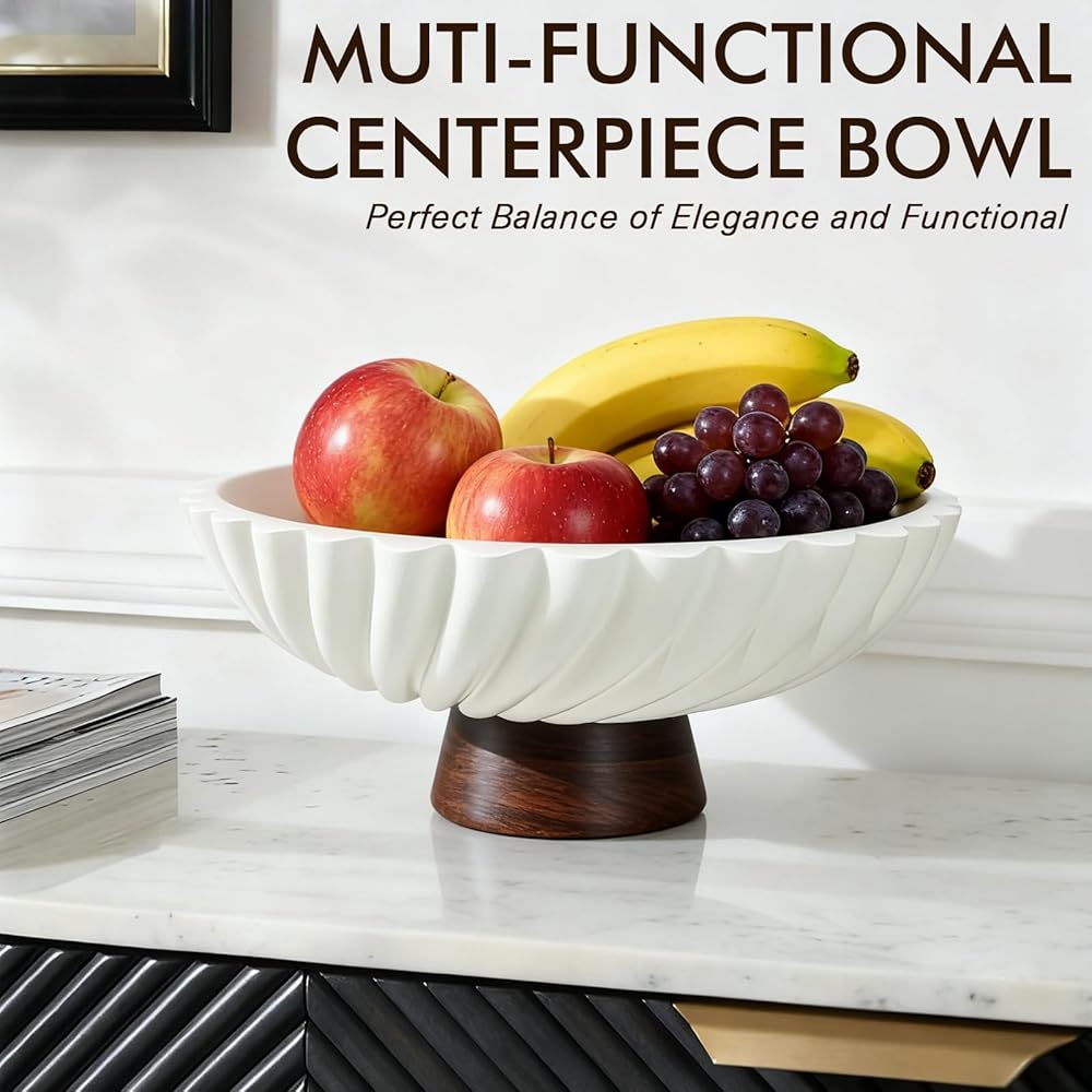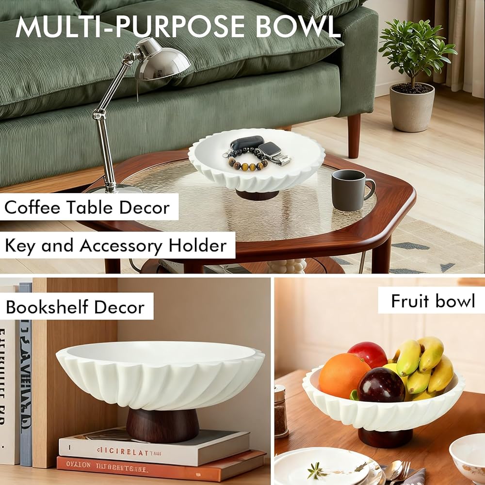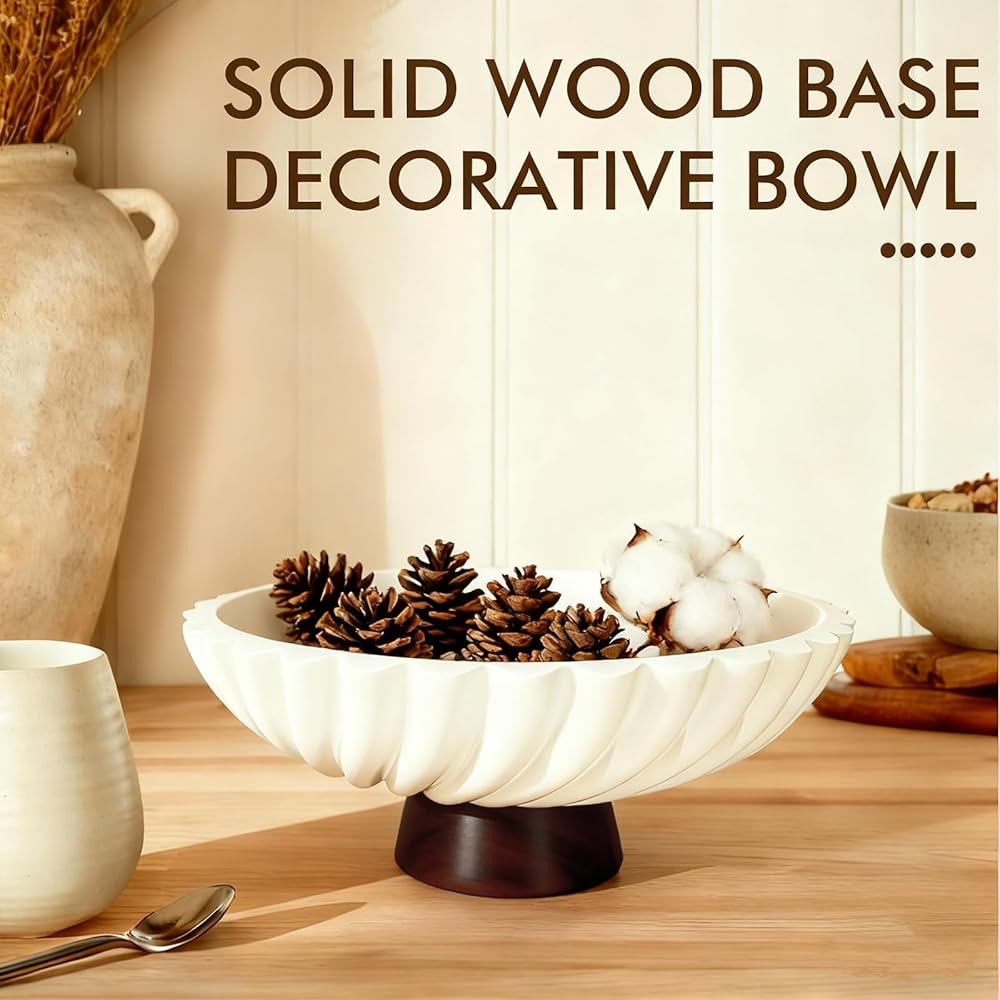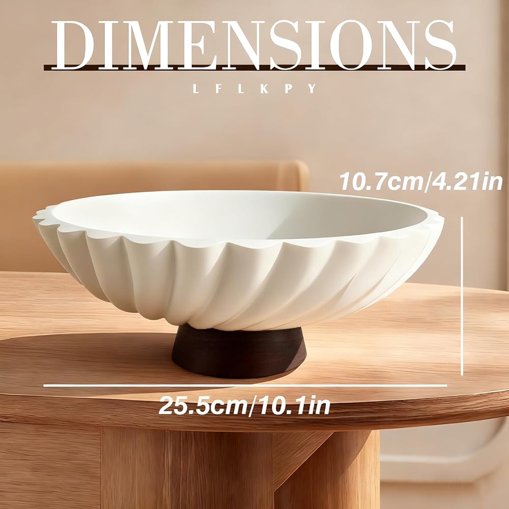 وعاء فواكه مزخرف من الخرسانة البيضاء مقاس 11 بوصة مع قاعدة خشبية - وعاء ديكور حديث ووعاء مفاتيح لطاولة الطعام وطاولة القهوة وديكور المطبخ والمنزل