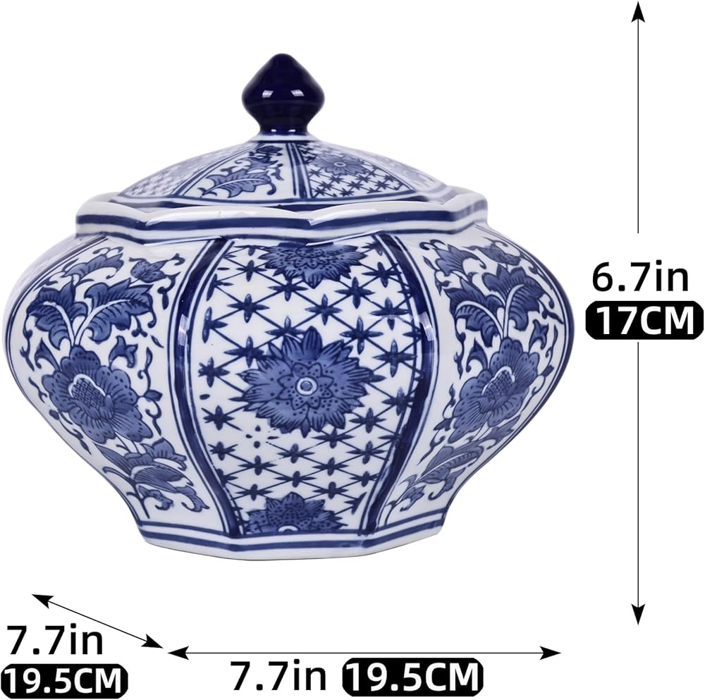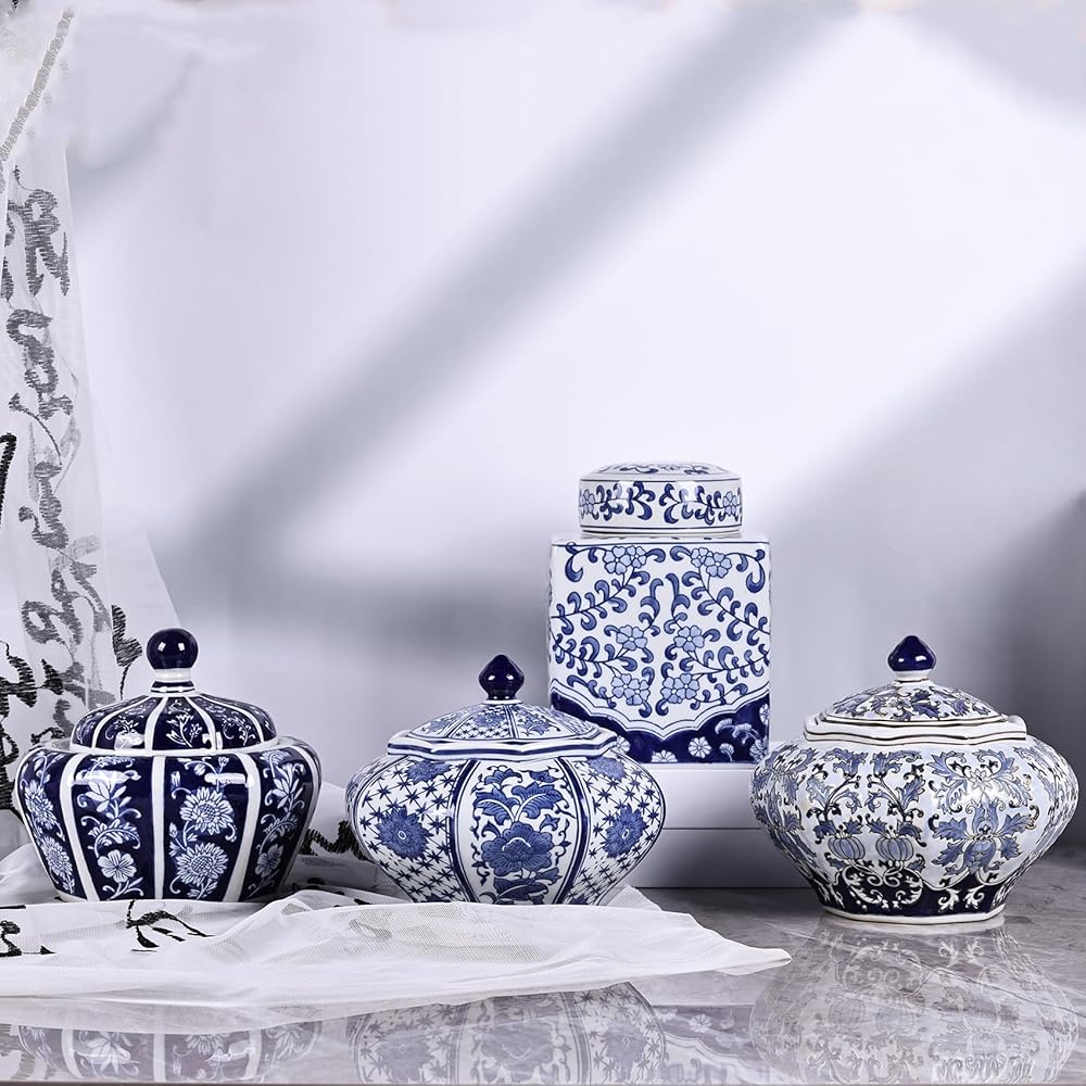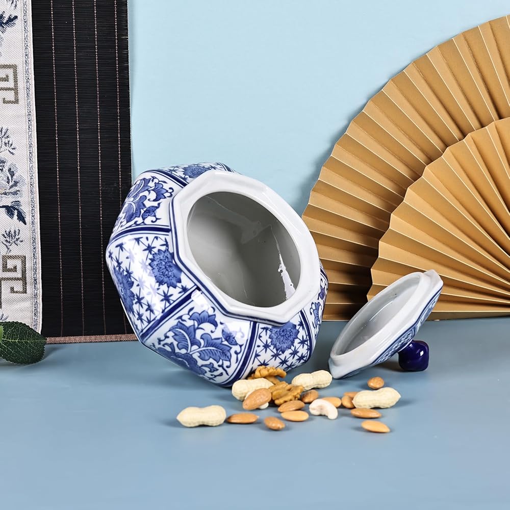 • 2. الخزف الصيني باللونين الأزرق والأبيض: استمتع بالأناقة الخالدة للتصميم الصيني مع أوعية الزنجبيل الخزفية باللونين الأزرق والأبيض. تتميز الجرة بزخارف صينية تقليدية تعكس جمال الفن الفني في عهد أسرة مينغ وتشينغ.