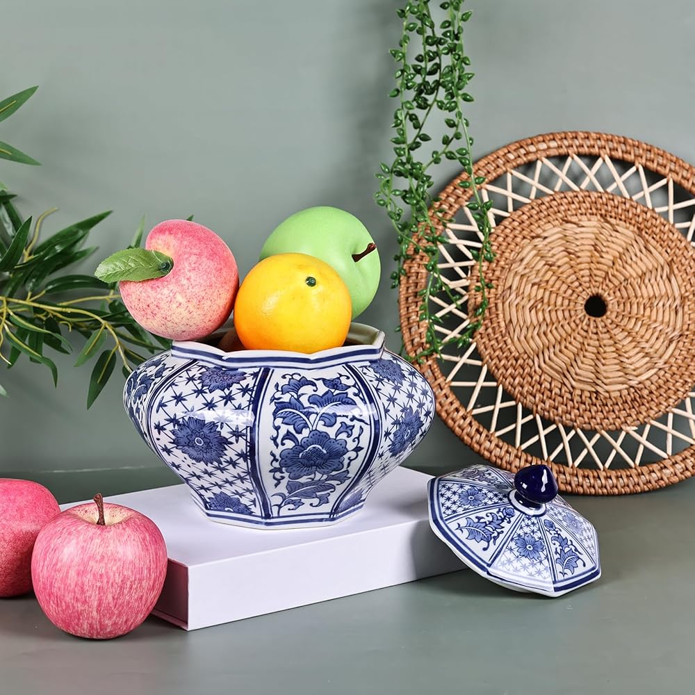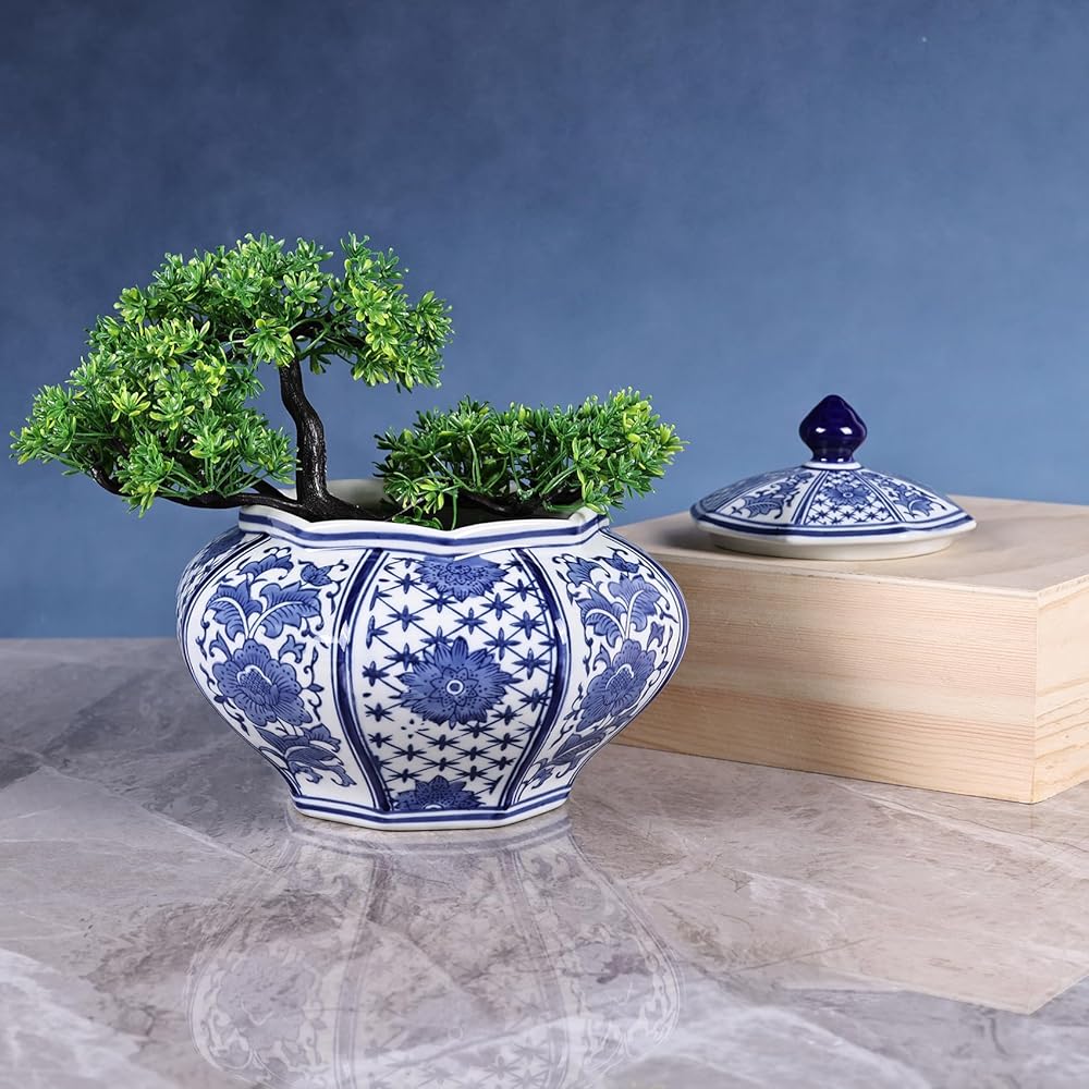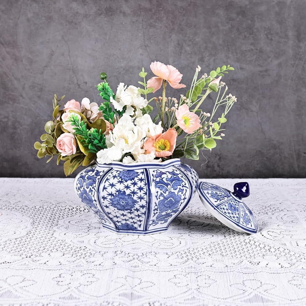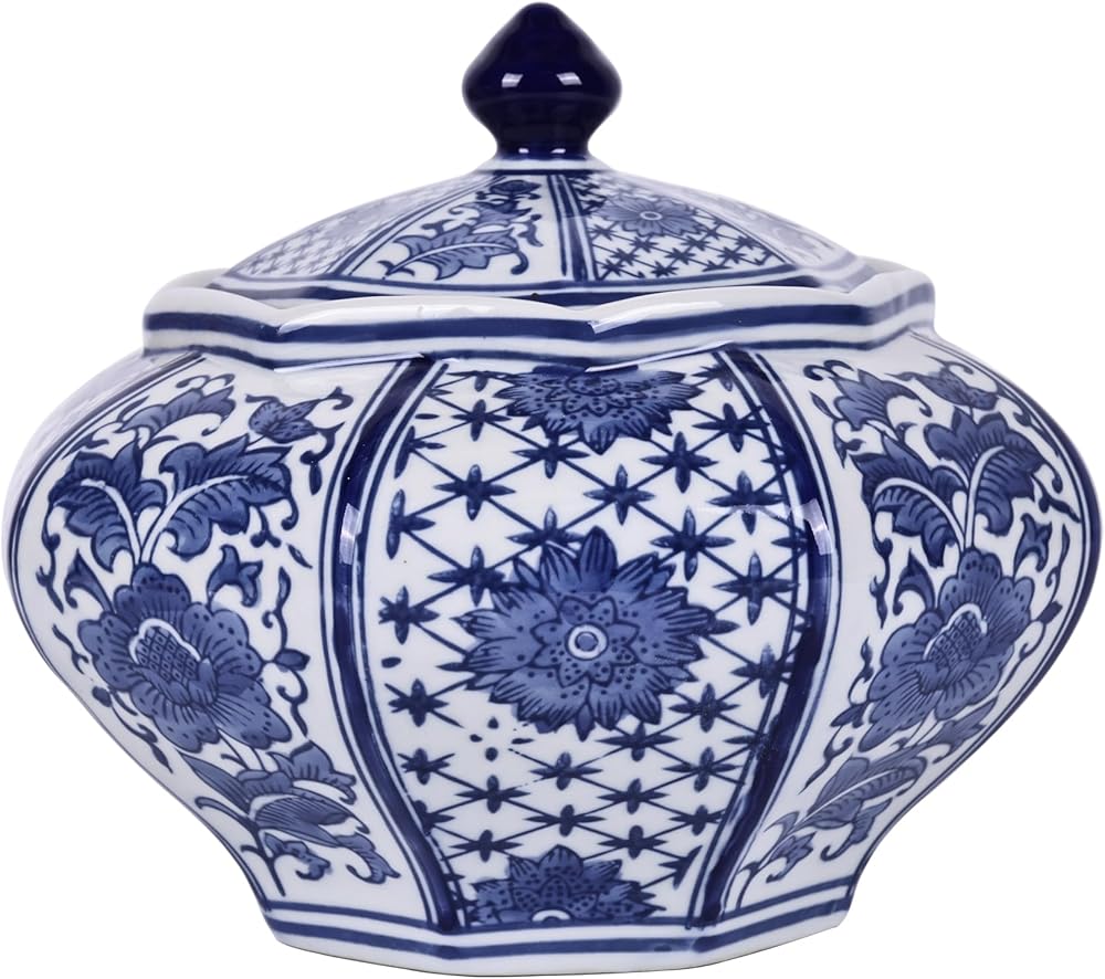 • 2. الخزف الصيني باللونين الأزرق والأبيض: استمتع بالأناقة الخالدة للتصميم الصيني مع أوعية الزنجبيل الخزفية باللونين الأزرق والأبيض. تتميز الجرة بزخارف صينية تقليدية تعكس جمال الفن الفني في عهد أسرة مينغ وتشينغ.