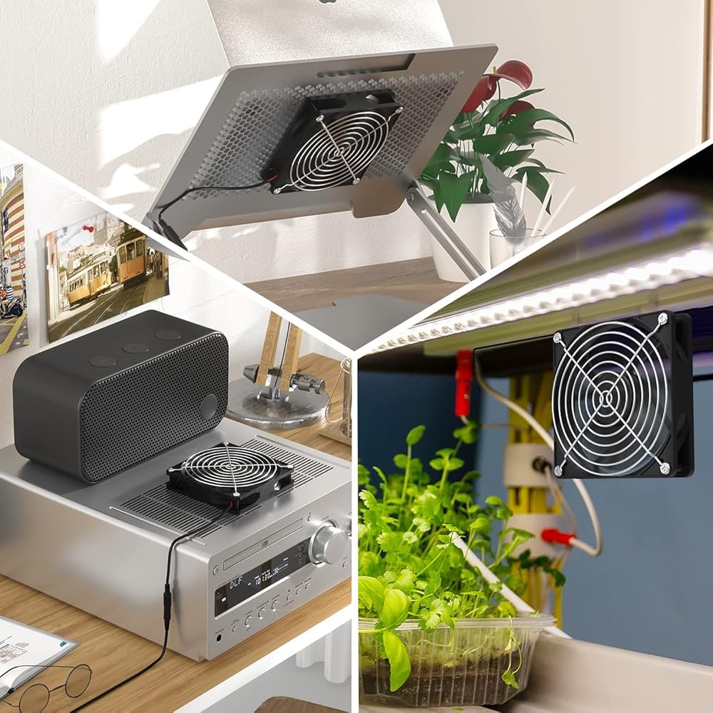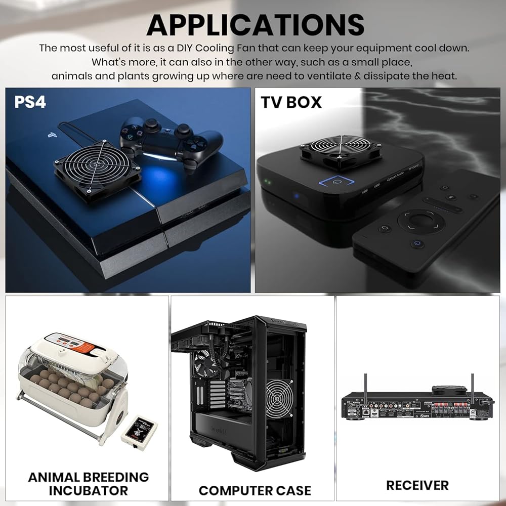 【استخدام واسع】عندما ترتفع درجة حرارة معداتك الإلكترونية أو بعض الأماكن الصغيرة، تكون مروحة التبريد في متناول اليد. يحافظ على برودة الجهاز أو الأماكن الصغيرة أو تبادل الهواء. أحضر الهواء بواسطة مروحة التبريد هذه إلى معداتك الإلكترونية، وأي أماكن صغيرة أخرى مثل الحيوانات والنباتات التي تكبر تحتاج إلى تبريدها أو تبادل الهواء. مثل جهاز اكس بوكس وبلاي ستيشن 4 ونظام الصوت ومكبر الصوت والراديو وجهاز الاستقبال ومعدات الصوت والخادم والثلاجة وبوابة الإنترنت وصندوق الكمبيوتر وخزانة الحوض العتيقة وصندوق اللحوم المجففة ومرطب الهواء الذي تصنعه بنفسك