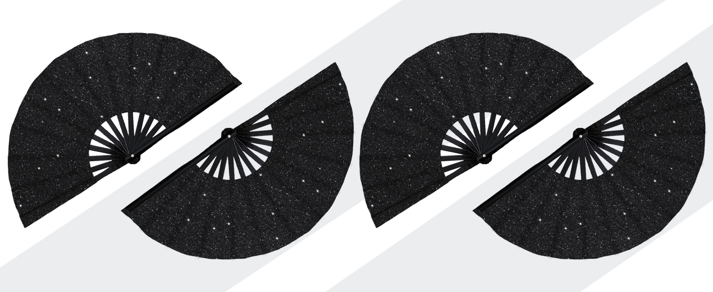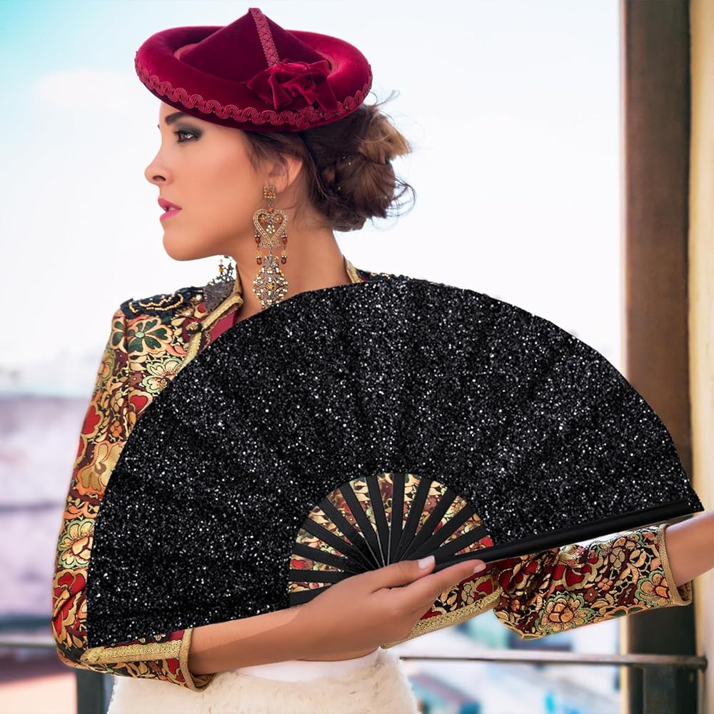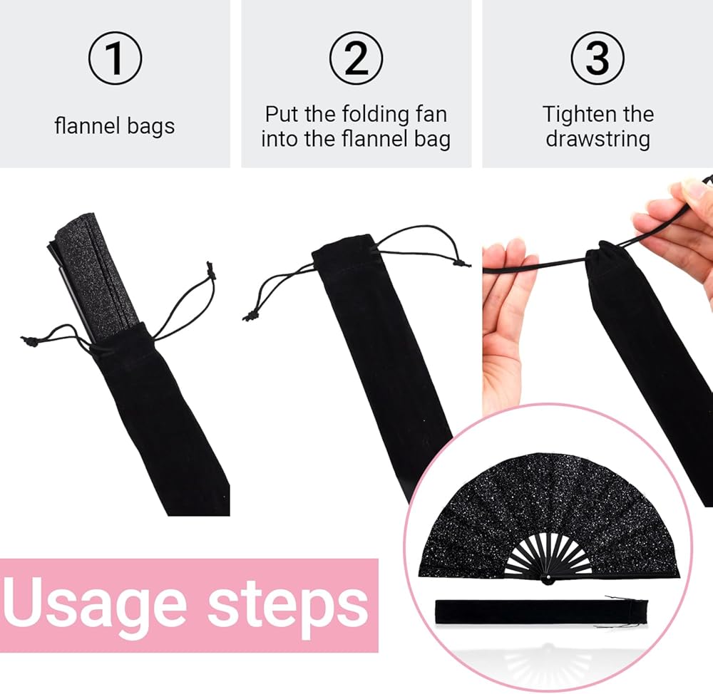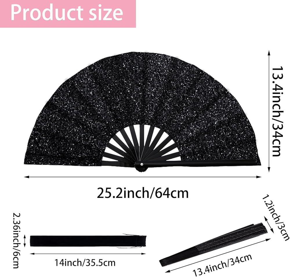 مروحة يد لامعة قابلة للطي: تحتوي العبوة على 4 قطع من المراوح للرقص باللون الأسود الكلاسيكي و4 حقائب من الفلانيل، حجم الفتحة للمراوح 25.2 × 13.4 بوصة ويمكن طيها حتى 13.4 × 1.2 بوصة، يسهل حملها في حقيبتك أو جيبك للاستخدام المريح في أي وقت وفي أي مكان