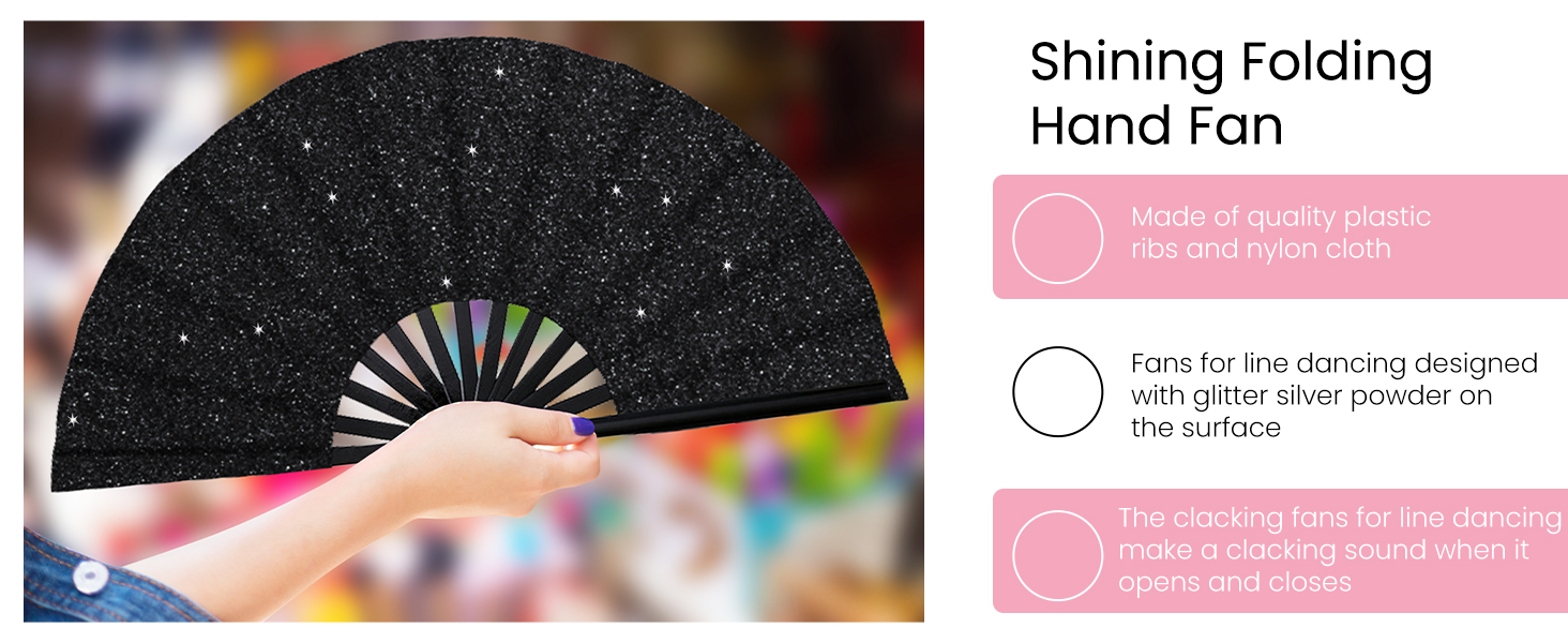 مروحة كلاك مثيرة للاهتمام: تصدر مراوح الطقطقة للرقص الخطي صوت طقطقة عند فتحها وإغلاقها، وتكون عملية الفتح والإغلاق سلسة، لذلك فهي قوية جدًا عند الرقص في مجموعة، وأيضًا إيقاعية جدًا عند الرقص بشكل فردي، يمكنك أيضًا استخدامها لتهوية نفسك بعد الرقص للحفاظ على البرودة.