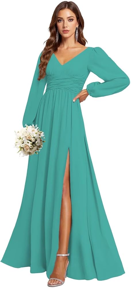 الميزات: فساتين وصيفة العروس بأكمام طويلة للنساء، فستان وصيفة العروس من الشيفون الناعم برقبة على شكل حرف V لحفلات الزفاف، فساتين السهرة الرسمية، فستان طويل لحفلات الزفاف مع فتحة عالية، أربطة من الخلف، طول الأرض، مشد، حمالة صدر مدمجة، خط، مكشكش، مطوي