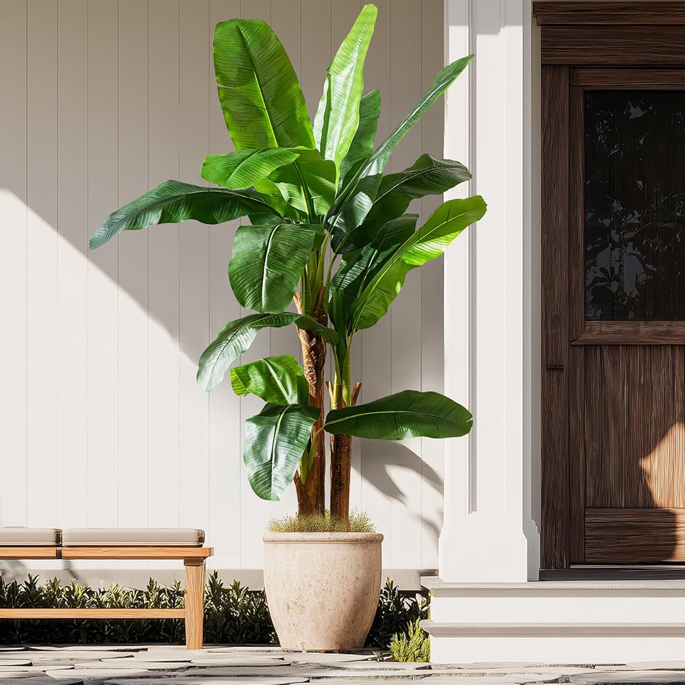 🌴 Realistic Tropical Appearance: Our tall artificial banana tree features large, vibrant green leaves with lifelike veining and a naturally sculpted trunk. This faux tree brings an authentic tropical vibe to your space, creating a permanent summer beach atmosphere without the need for a single drop of water.