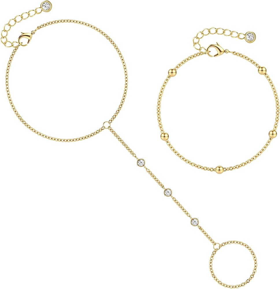 Durable Finger Ring Slave Bracelet Non Tarnish: Crafted with robust brass materials, our stackable gold plated chain link bracelets set feature sturdy clasps designed to resist deformation and maintain their shape. Don't worry about breaking during transportation or after wearing our adjustable hand chain bracelets, it is very sturdy and durable.