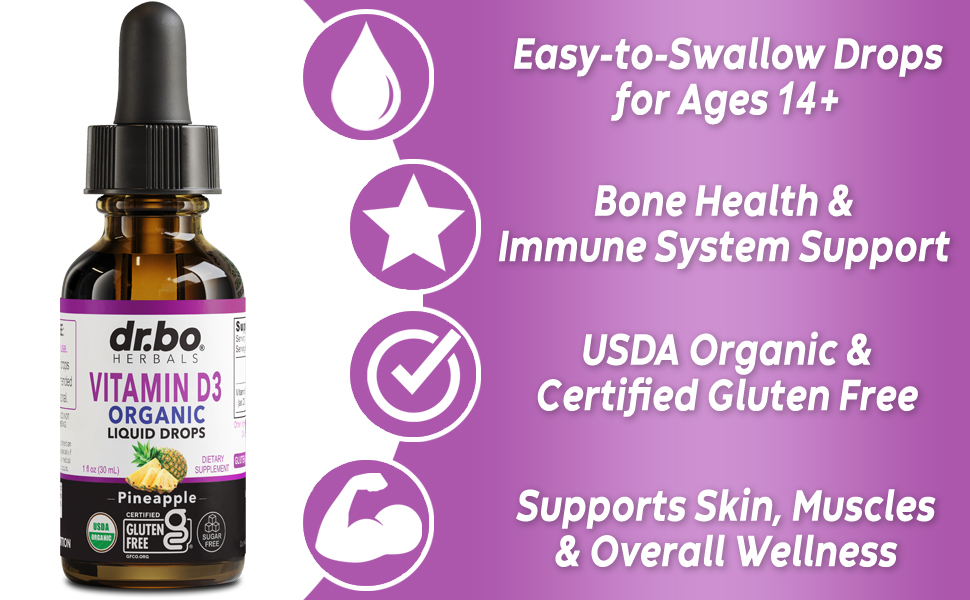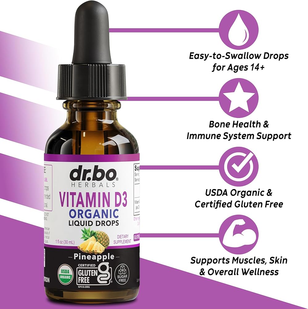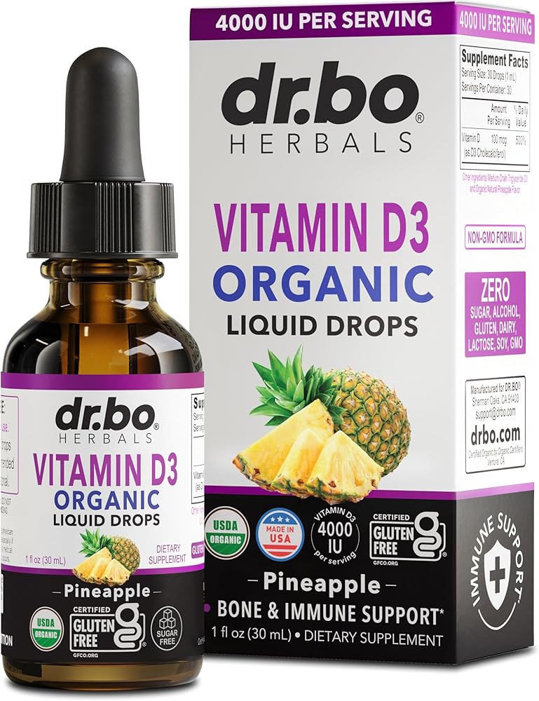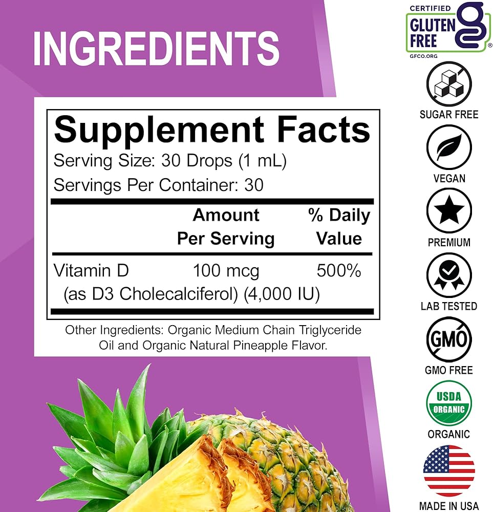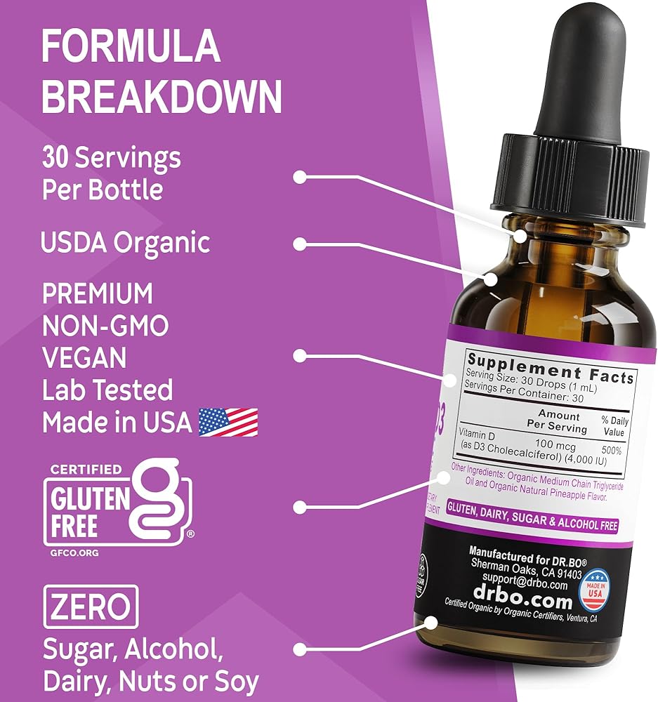 قطرات سائل فيتامين د 3 العضوية: ادعم الجهاز المناعي والعظام والعضلات من خلال مكملات قطرات د 3 العضوية للبالغين والأطفال؛ إنه لذيذ ويحتوي على 100 ميكروجرام و4000 وحدة دولية من فيتامين د لكل جرعة