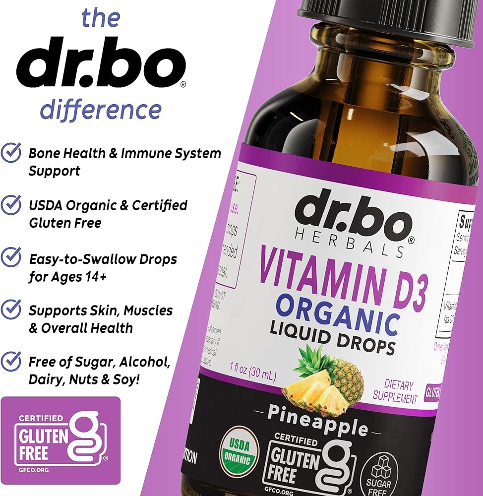 جودة فاخرة: قطرات فيتامين د السائل من دكتور بو عضوية، وغير معدلة وراثيًا، ونباتية، ومنتجات ألبان الصويا، وخالية من الغلوتين، ومصنوعة في منشأة تعتمد ممارسات التصنيع الجيدة؛ يساعد فيتامين D3 في امتصاص قطرات سائل D3 النباتية الصحية من الفوسفور والكالسيوم