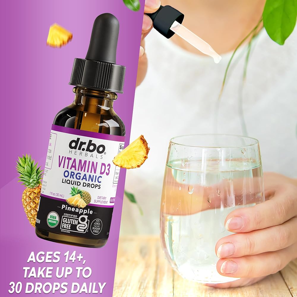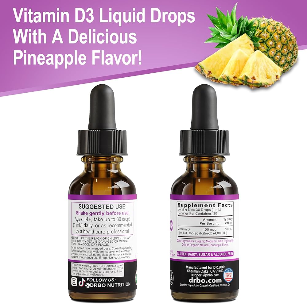 سهل الاستخدام: للأعمار من 14 عامًا فما فوق، يتمتع فيتامين د السائل للبالغين والأطفال بنكهة الأناناس اللذيذة؛ دكتور بو فيتامين د 3 قطرات سائلة مكمل عضوي يعطي 4000 وحدة دولية من فيتامين د قطرات زيت لكل جرعة