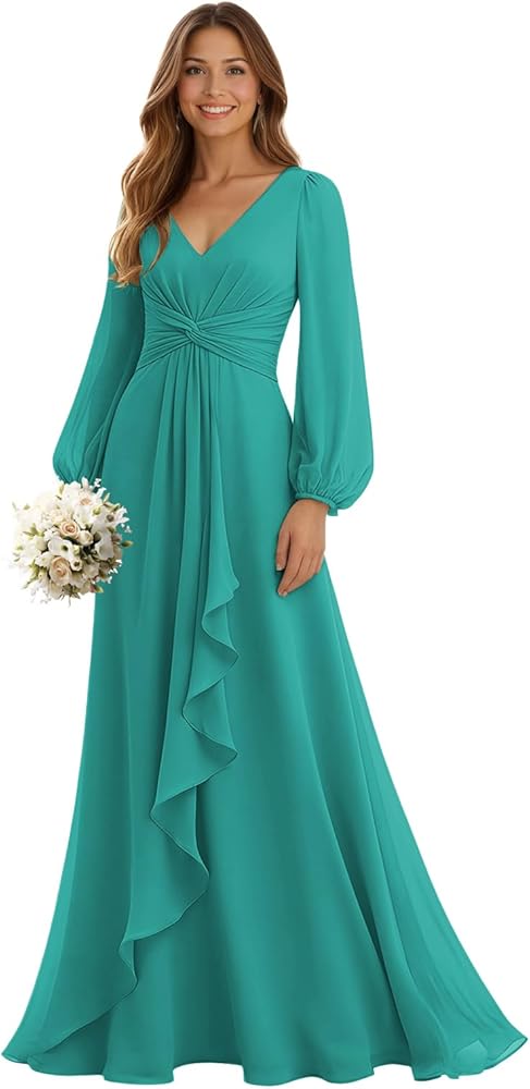 • المزايا: فساتين وصيفة العروس بأكمام طويلة للنساء، فستان وصيفة العروس من الشيفون الناعم برقبة على شكل حرف V لحفلات الزفاف، فساتين سهرة رسمية مع كشكشة، فستان طويل لحفلات الزفاف بأكمام، برباط من الخلف، طول الأرض، مشد، حمالة صدر مدمجة، خط، مكشكش، مطوي