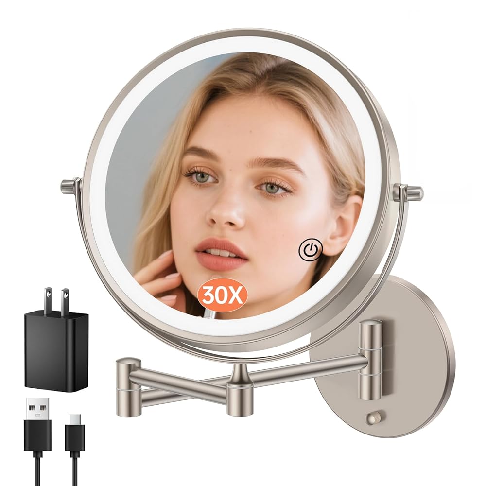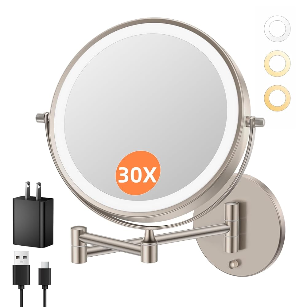 مرآة مكياج مضيئة مثبتة على الحائط مقاس 10 بوصات 30X/1X من FUNTOUCH، مرآة مزدوجة الجوانب قابلة لإعادة الشحن بقدرة 5000 مللي أمبير في الساعة، 3 أضواء ملونة، قابلة للتعتيم باللمس، ذراع ممتد يدور 360 درجة مع محول، فرشاة نيكل