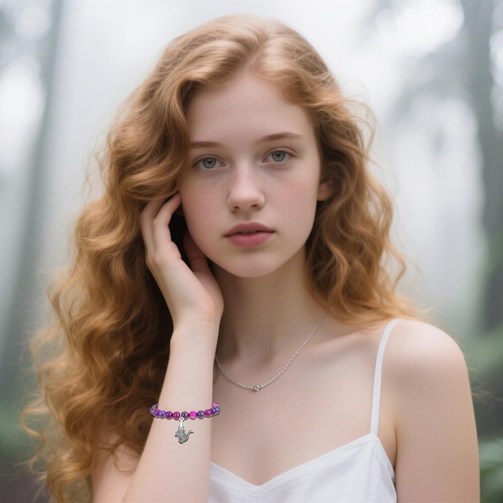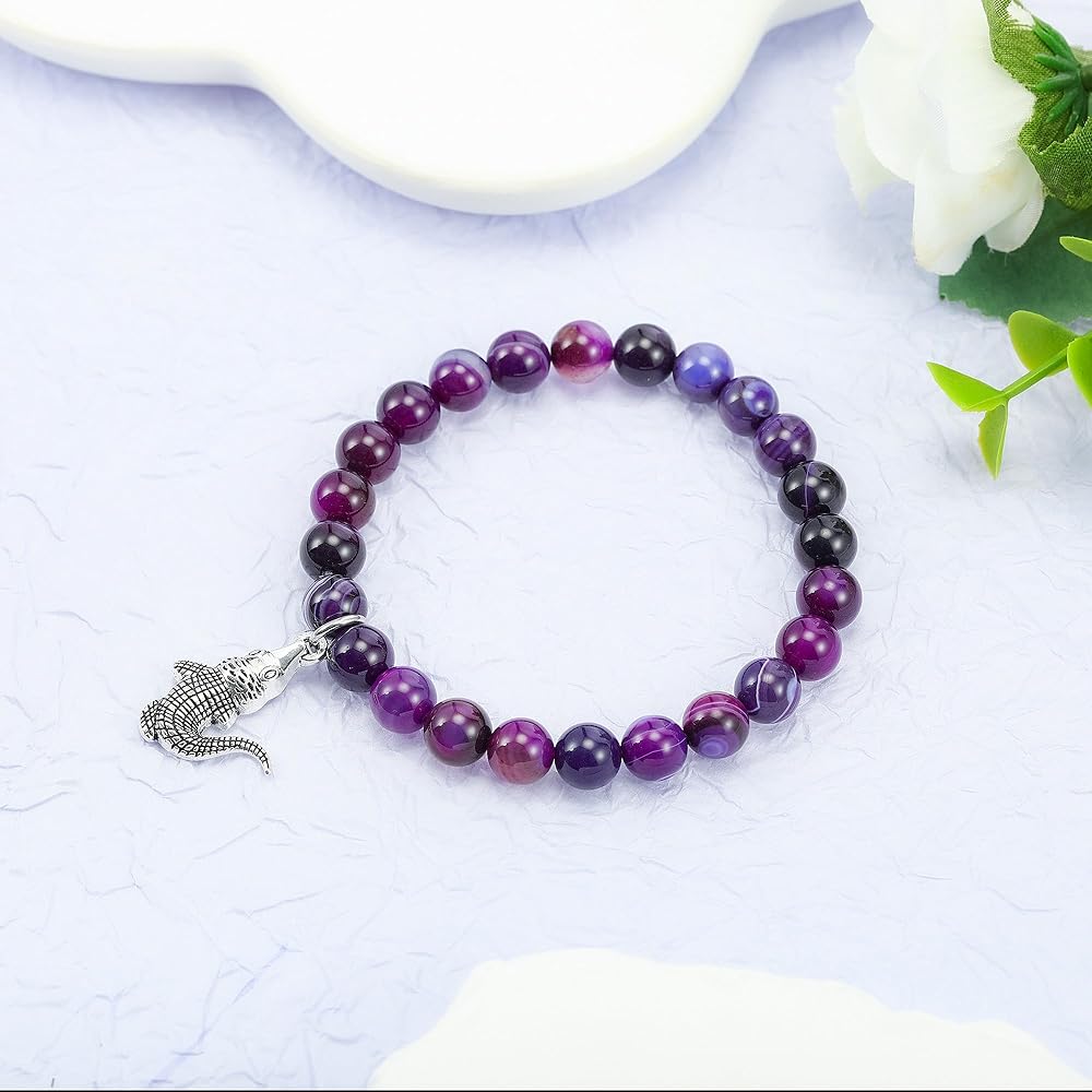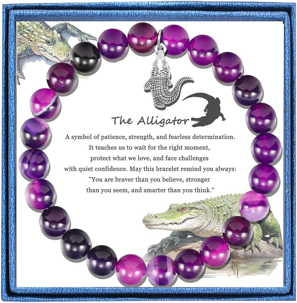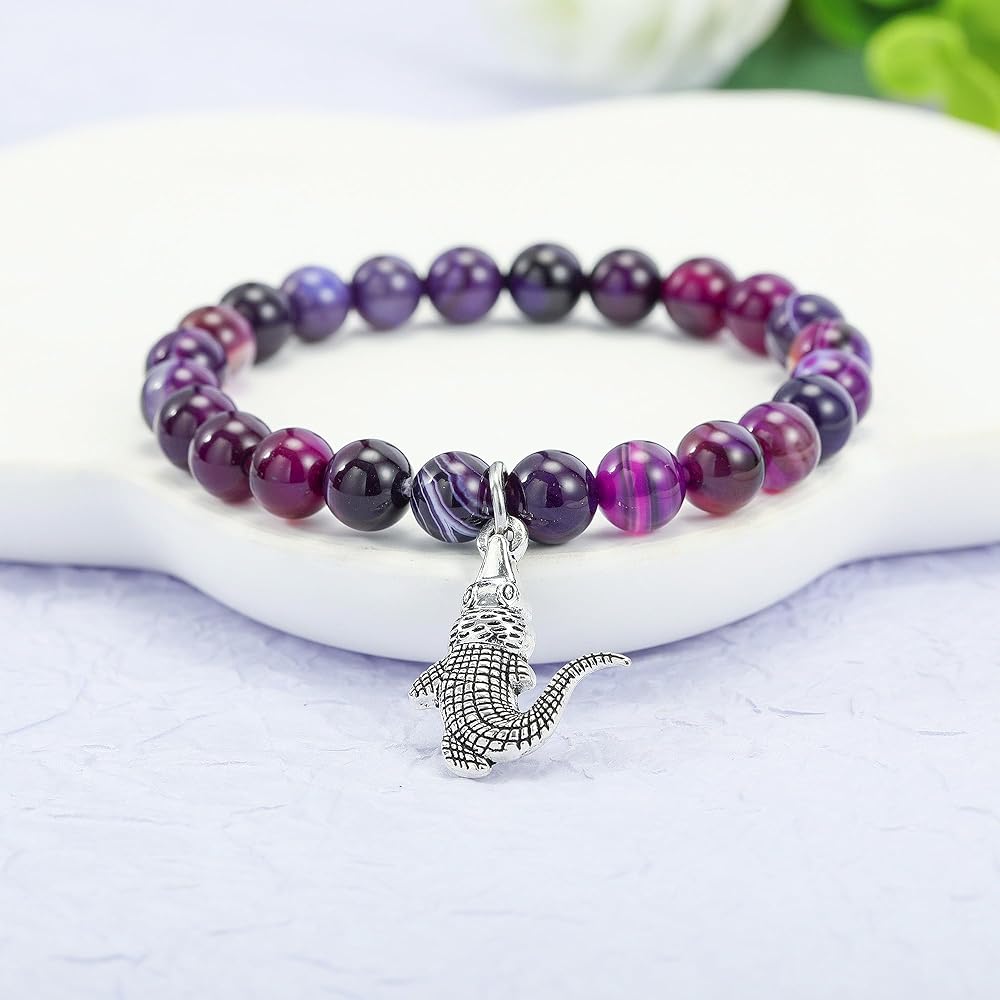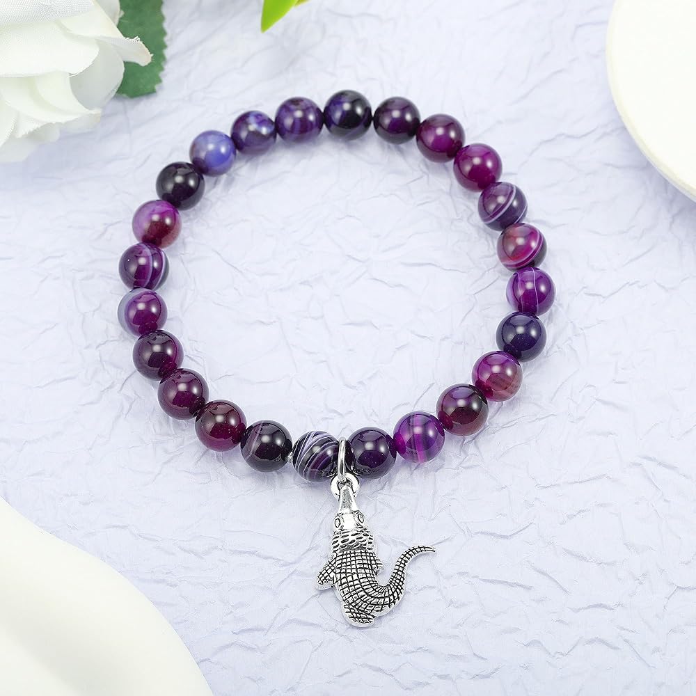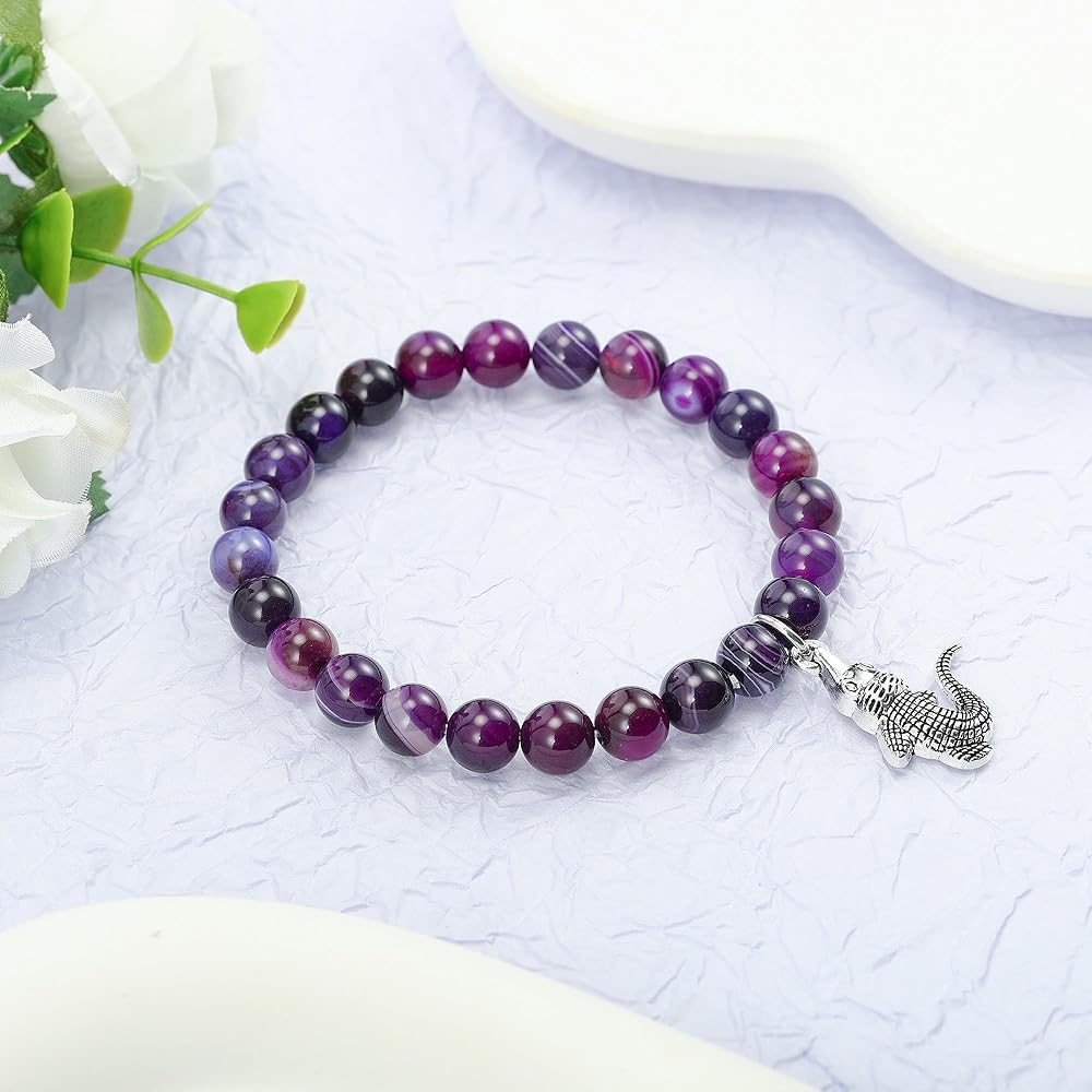 Channel the fearless spirit of the crocodile with this Alligator Bracelet, a striking piece of natural stone jewelry designed for animal lovers and those who draw inspiration from nature's most powerful symbols. Known for their strength, patience, and sharp instincts, crocodiles embody resilience and the courage to protect what truly matters. Wearing this bracelet serves as a meaningful reminder to trust your instincts, embrace your inner strength, and face life's challenges with confidence. Crafted with 8mm natural purple agate gemstones, this bracelet radiates soothing energy while carrying the deep symbolism of balance and protection. Purple agate is often associated with emotional clarity, calm reflection, and stress relief, making it an empowering companion for both quiet moments of meditation and the unpredictability of daily life. Its grounding energy encourages patience and mindfulness while strengthening one's sense of inner stability. The bracelet is designed with both durability and comfort in mind. Strung on a high-quality double-layer elastic cord, it stretches with ease to fit most wrist sizes, with an inner diameter of about 3.5 inches. Each bead is polished smooth, providing a lightweight and natural feel, making this bracelet ideal for everyday wear—whether you're at work, spending time in nature, or reflecting on personal growth. Just like the crocodile that thrives in both land and water, this bracelet adapts effortlessly to your lifestyle. More than an accessory, this bracelet carries profound meaning. The crocodile charm symbolizes protection, courage, and resilience, making it a thoughtful gift for loved ones navigating change, celebrating milestones, or seeking encouragement during difficult times. Whether you're drawn to the spiritual symbolism, the healing qualities of purple agate, or simply the unique design, this bracelet is a meaningful keepsake that inspires strength and confidence. Each bracelet comes ready to gift, packaged in a minimalist jewelry box with a meaningful message card that highlights the crocodile's symbolism and the energy of purple agate. Perfect for birthdays, graduations, anniversaries, or as a supportive gesture, this bracelet is both stylish and symbolic. Celebrate resilience, protection, and inner power with a one-of-a-kind piece that carries a timeless message: trust yourself, move forward bravely, and protect what you value most.